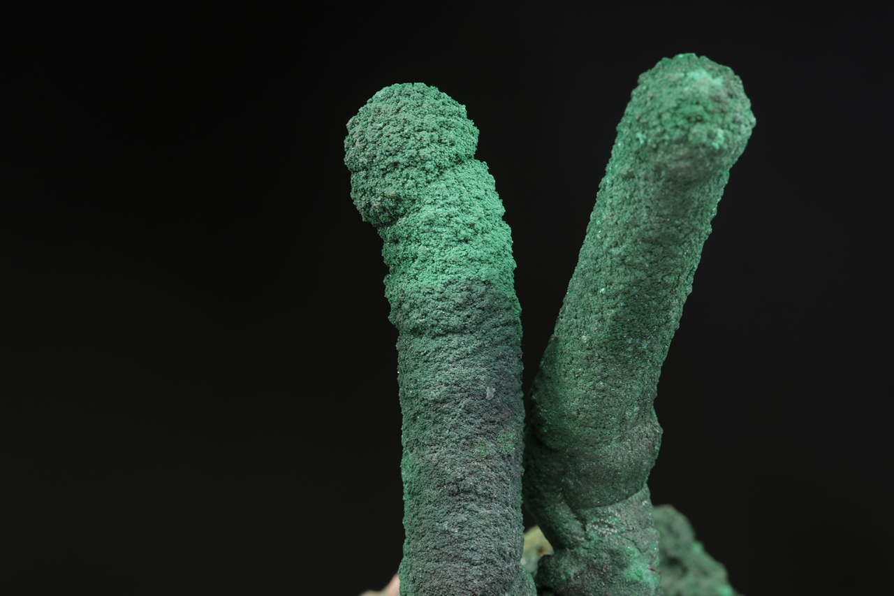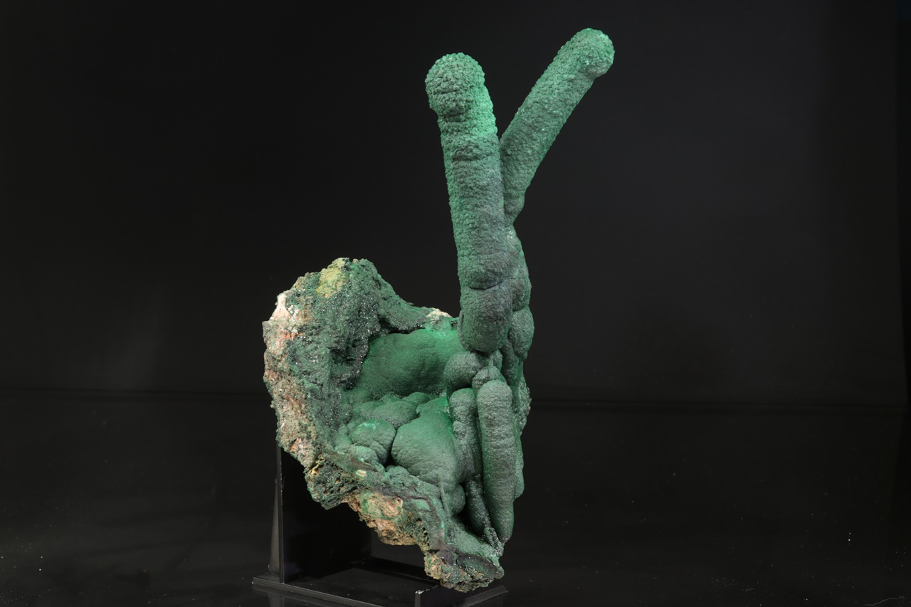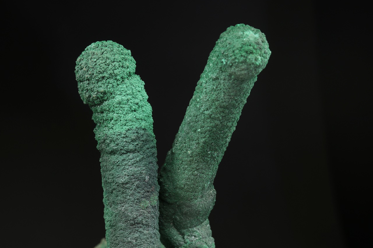 Dva neobvykle velké krápníky malachitu vyrůstající z podložky tvořené ledvinitými agregáty. Vzorek byl profesionálně opravený po té, co se odlomil pravý krápník. Nádherný vzorek sytě zeleného malachitu z vyhlášené lokality.