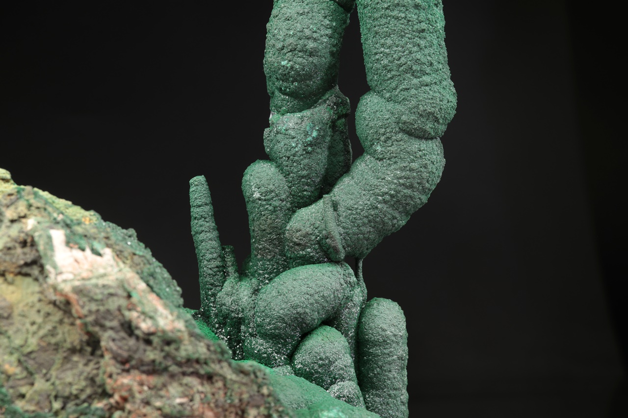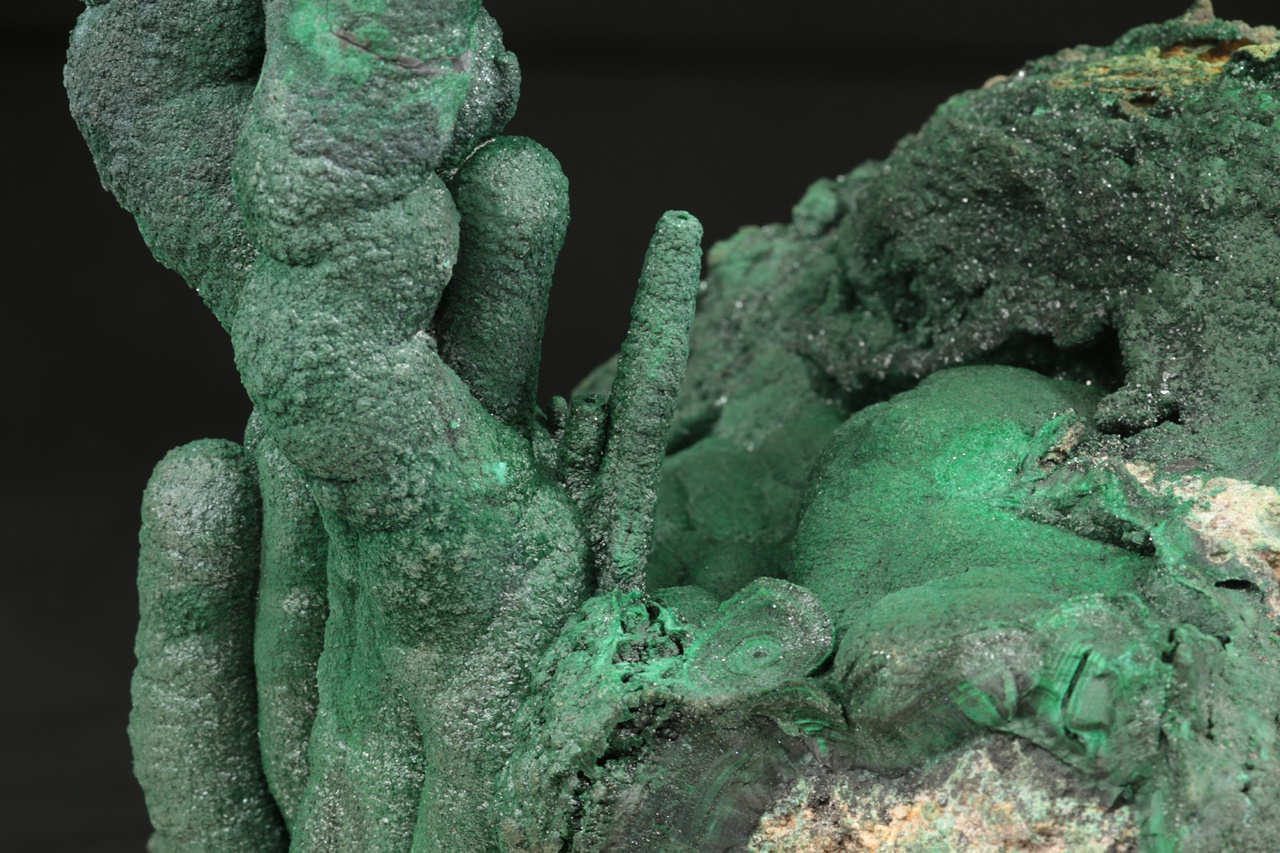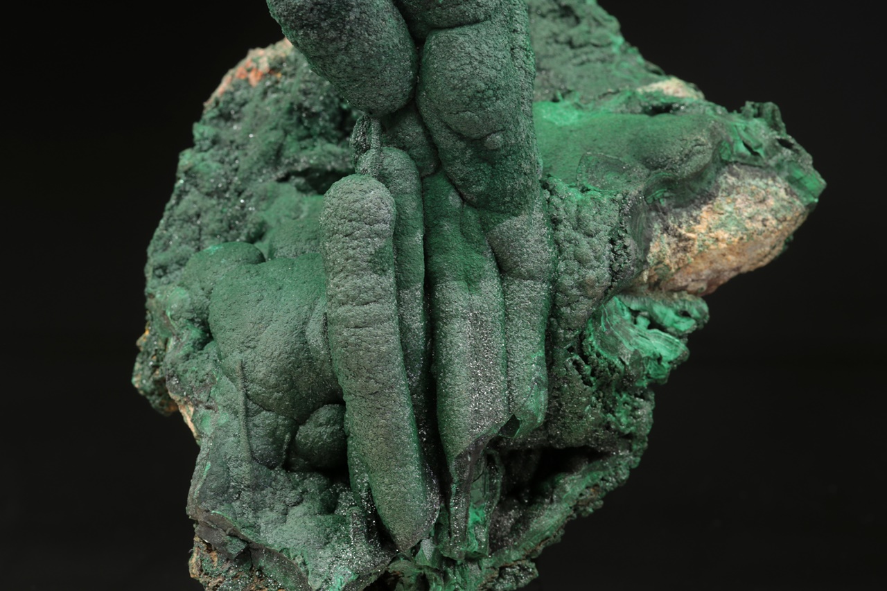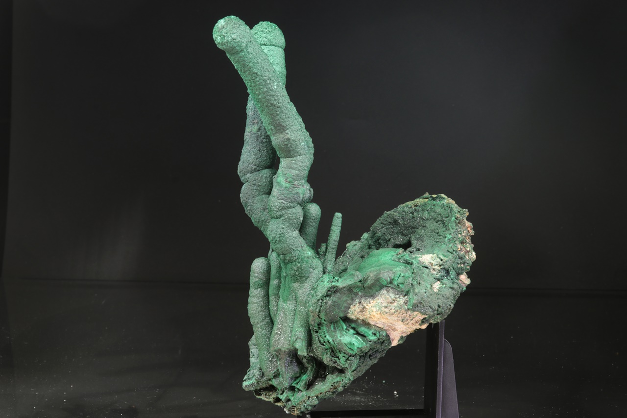 Dva neobvykle velké krápníky malachitu vyrůstající z podložky tvořené ledvinitými agregáty. Vzorek byl profesionálně opravený po té, co se odlomil pravý krápník. Nádherný vzorek sytě zeleného malachitu z vyhlášené lokality.