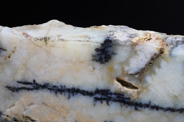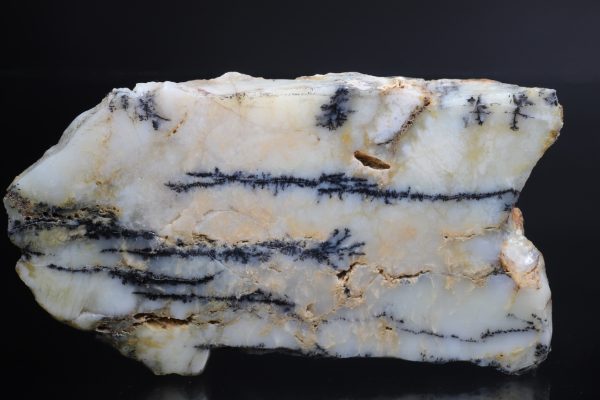 Velký z jedné strany leštěný vzorek bílého až nažloutlého opálu s dendritickými vrostlicemi Mn oxidů.
