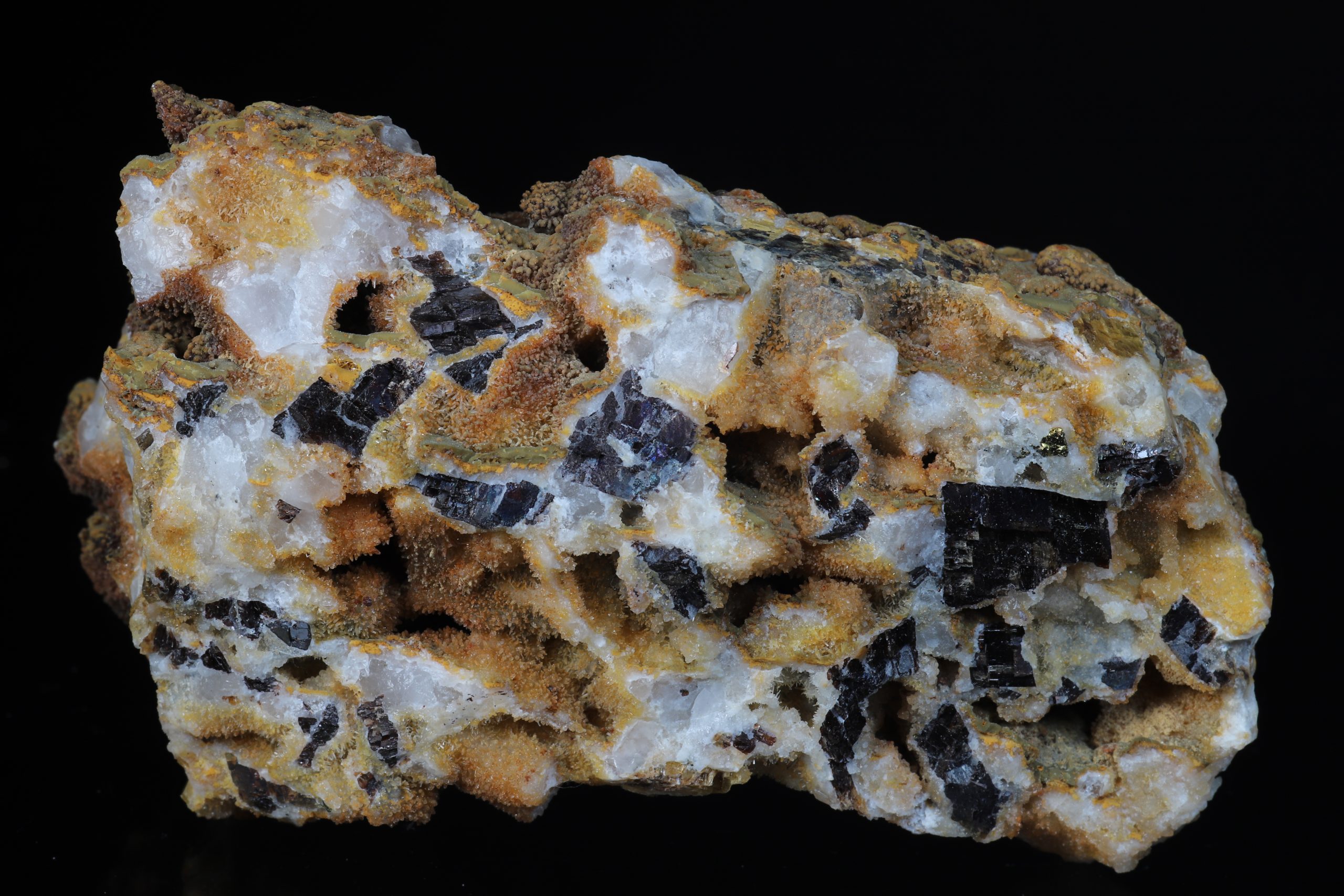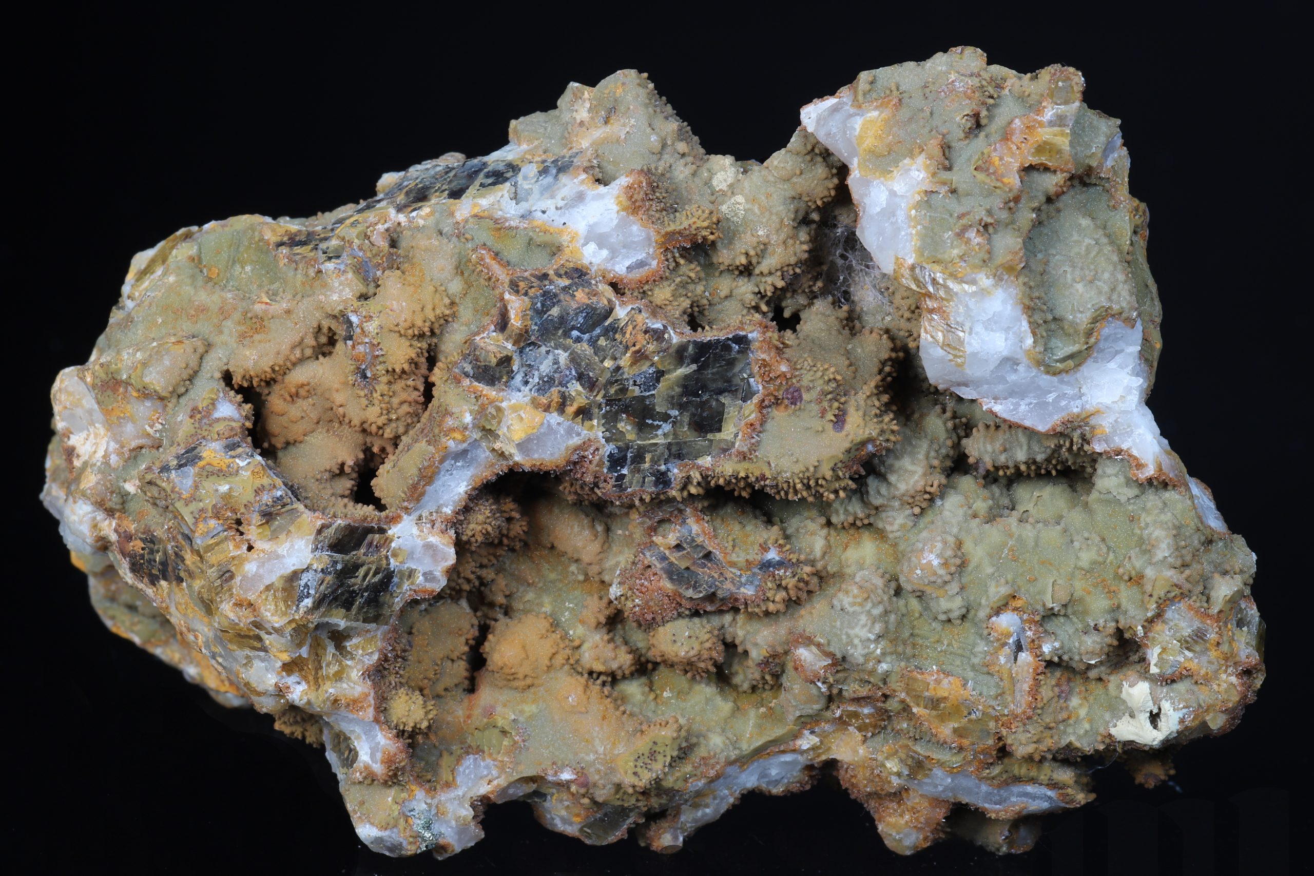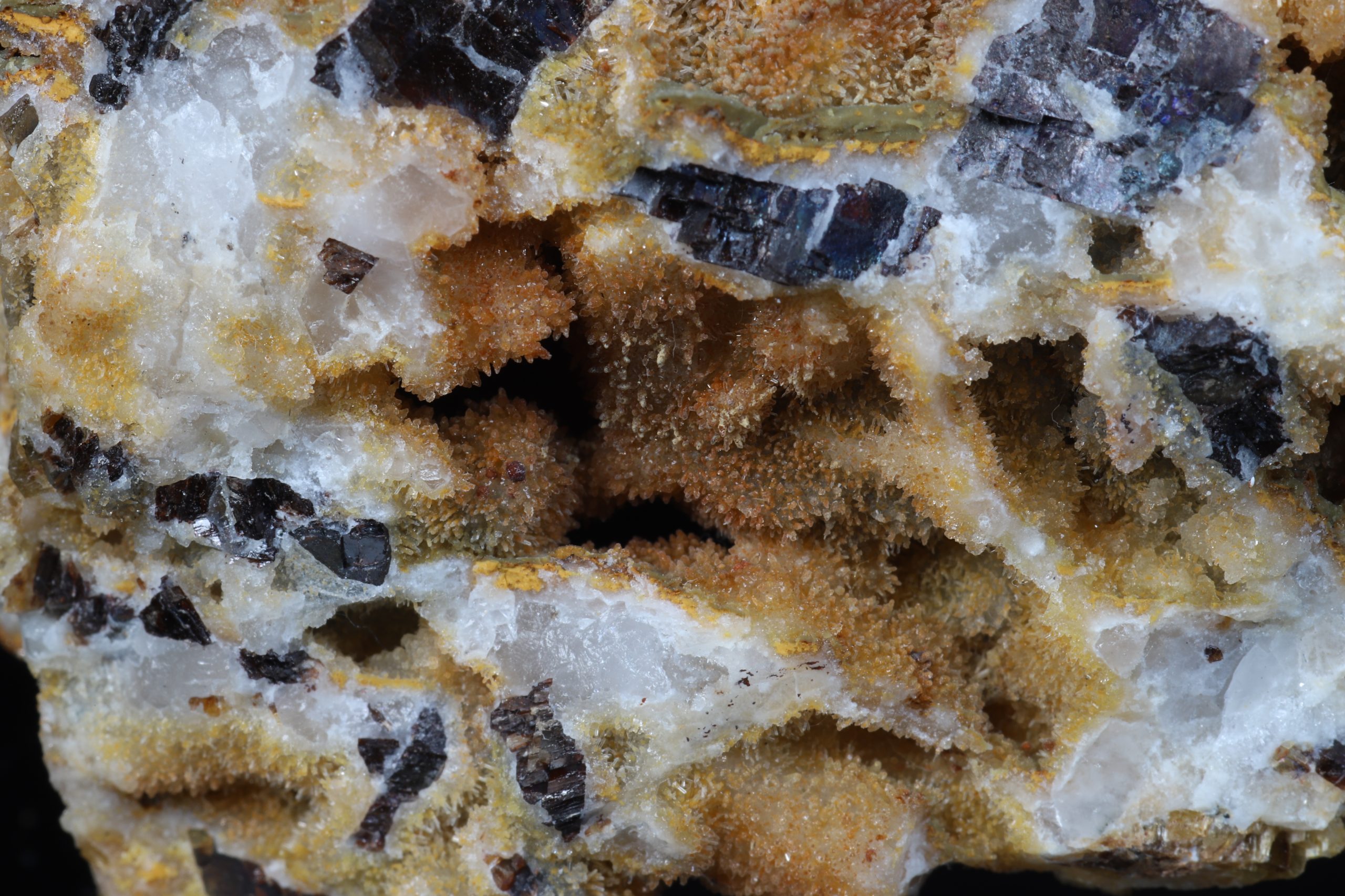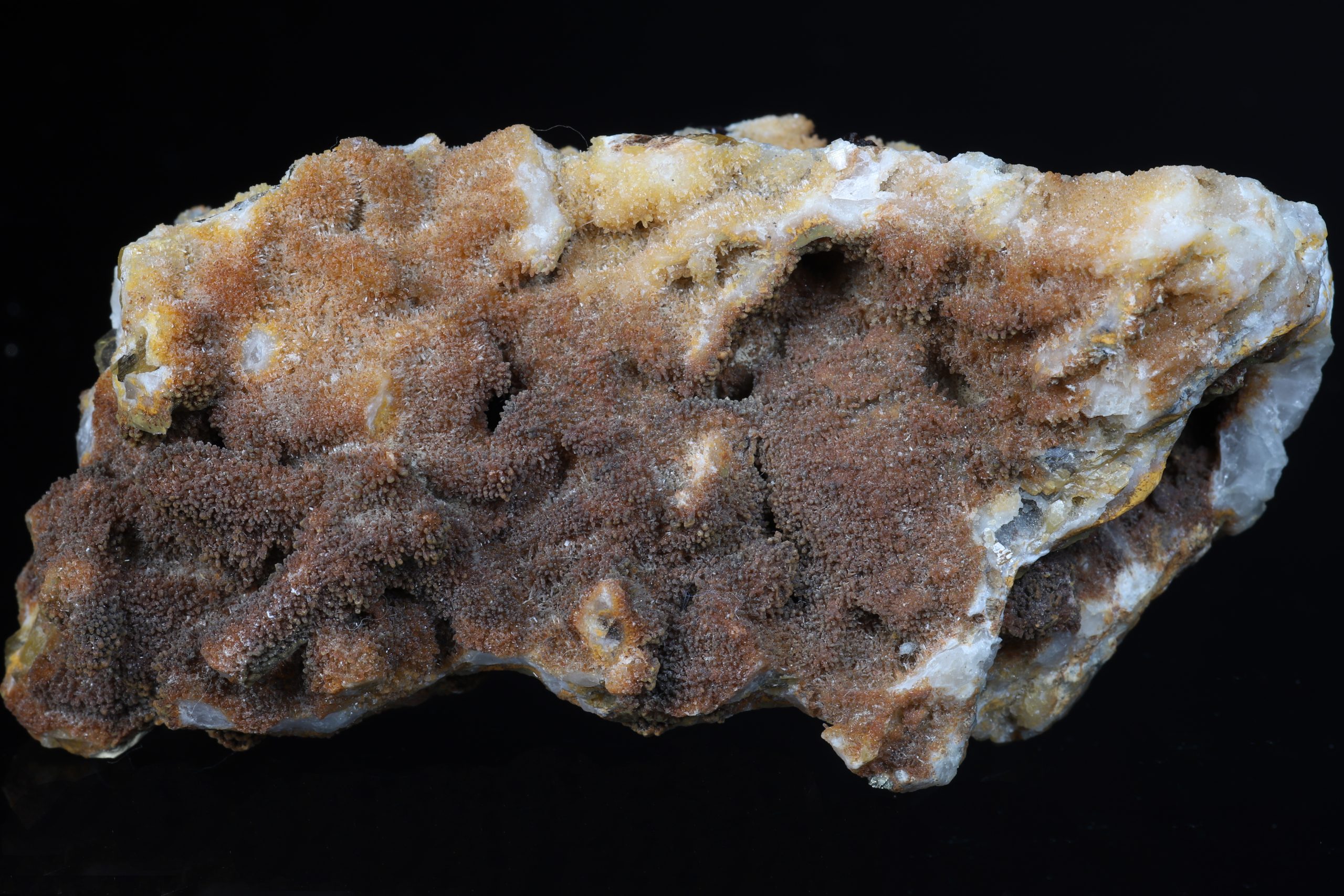 Vzorek štěpných hnědavých krystalů sideritu bohatě ze všech stran porostlých krustou a sloupcovitými krystaly bílého a narezavělého pachnolitu, velmi vzácného halidu (fluoridu) hliníku, vápníku a sodíku. Vzorek pochází z typové lokality Ivigtut v Grónsku.