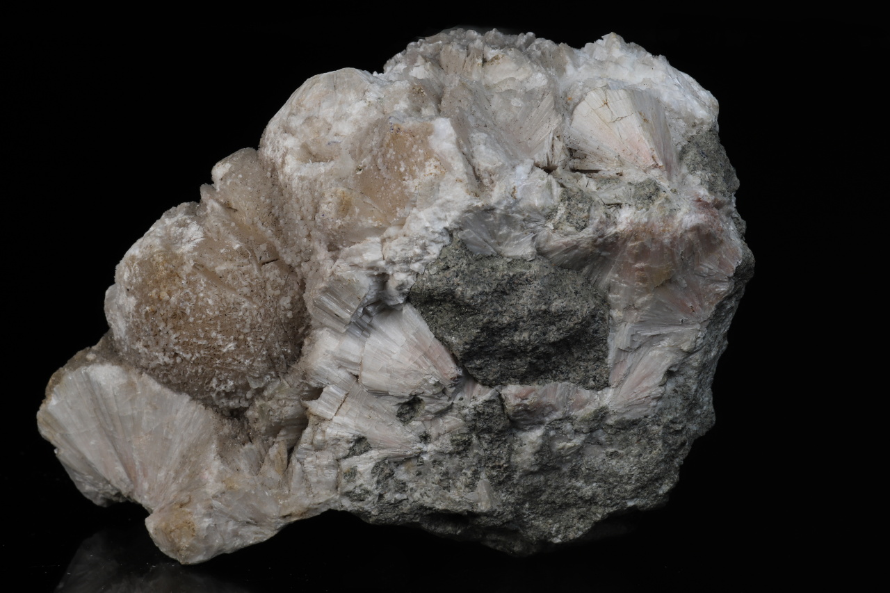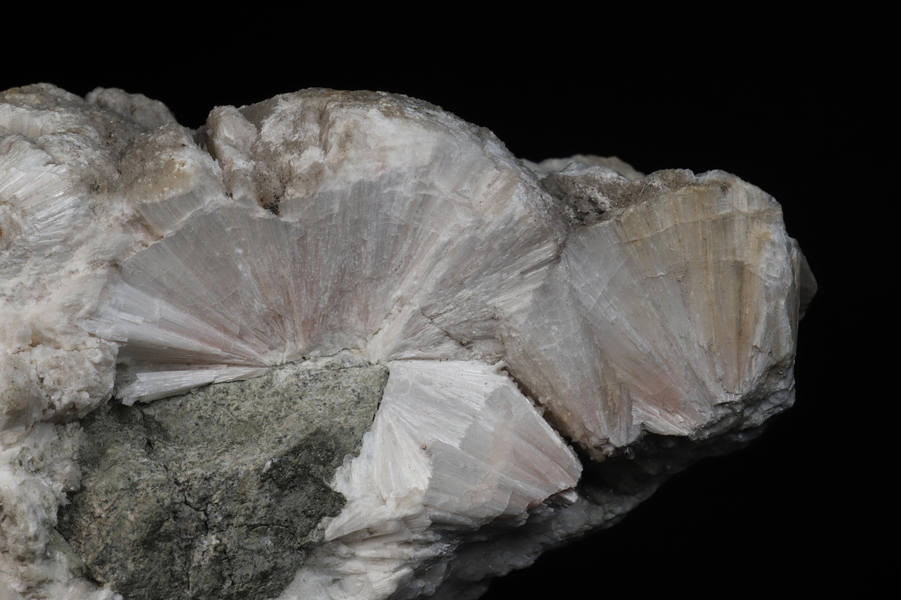 Bohatý vzorek radiálně paprsčitých až 5 cm velkých agregátů bílého pektolitu z klasické lokality kamenolomu v Košťálově.