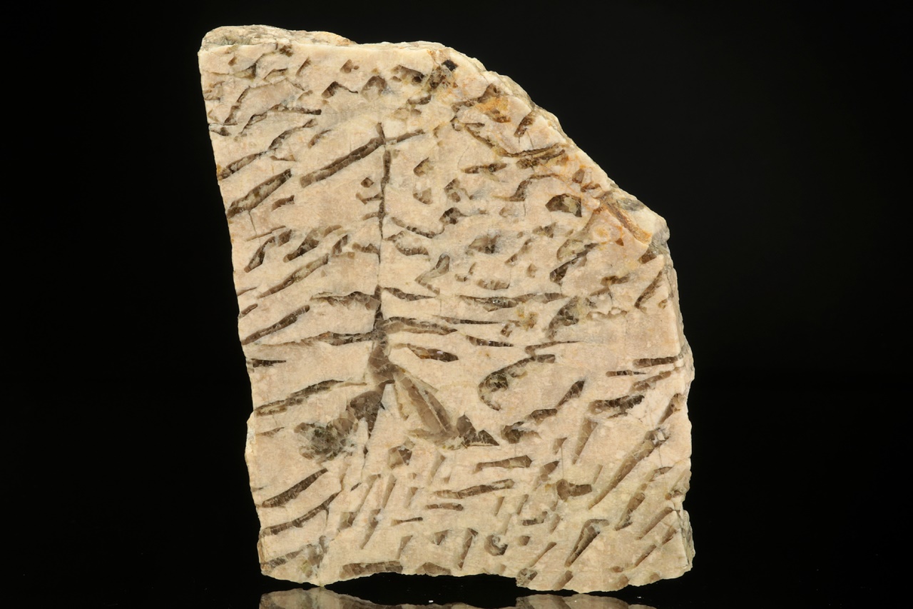Leštěný vzorek šedého křemene prorůstajícího se světlým živcem. Pro svou podobu s různými druhy písma se tato hornina nazýva písmenkový pegmatit.