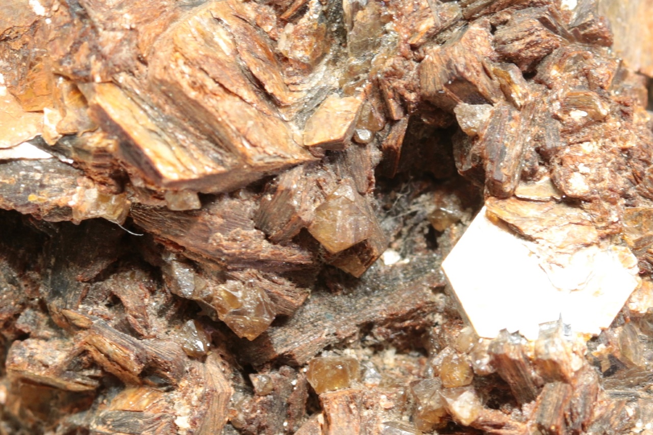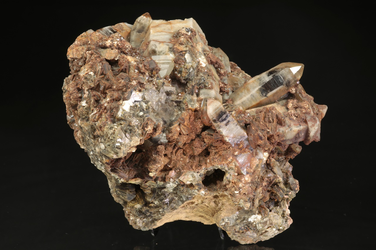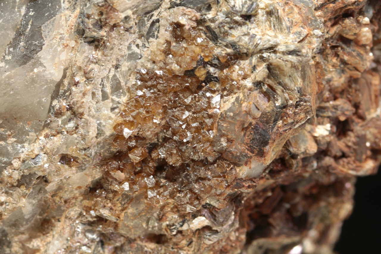 Srostlice krystalů záhnědy pokrytých tabulárními krystaly cinvalditu. V poslední fázi na vzorek narůstají krystaly a shluky krystalů hnědého scheelitu.