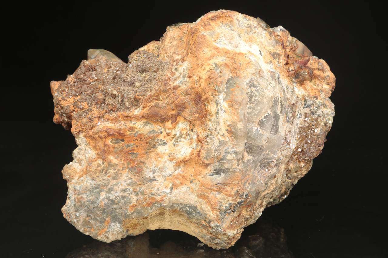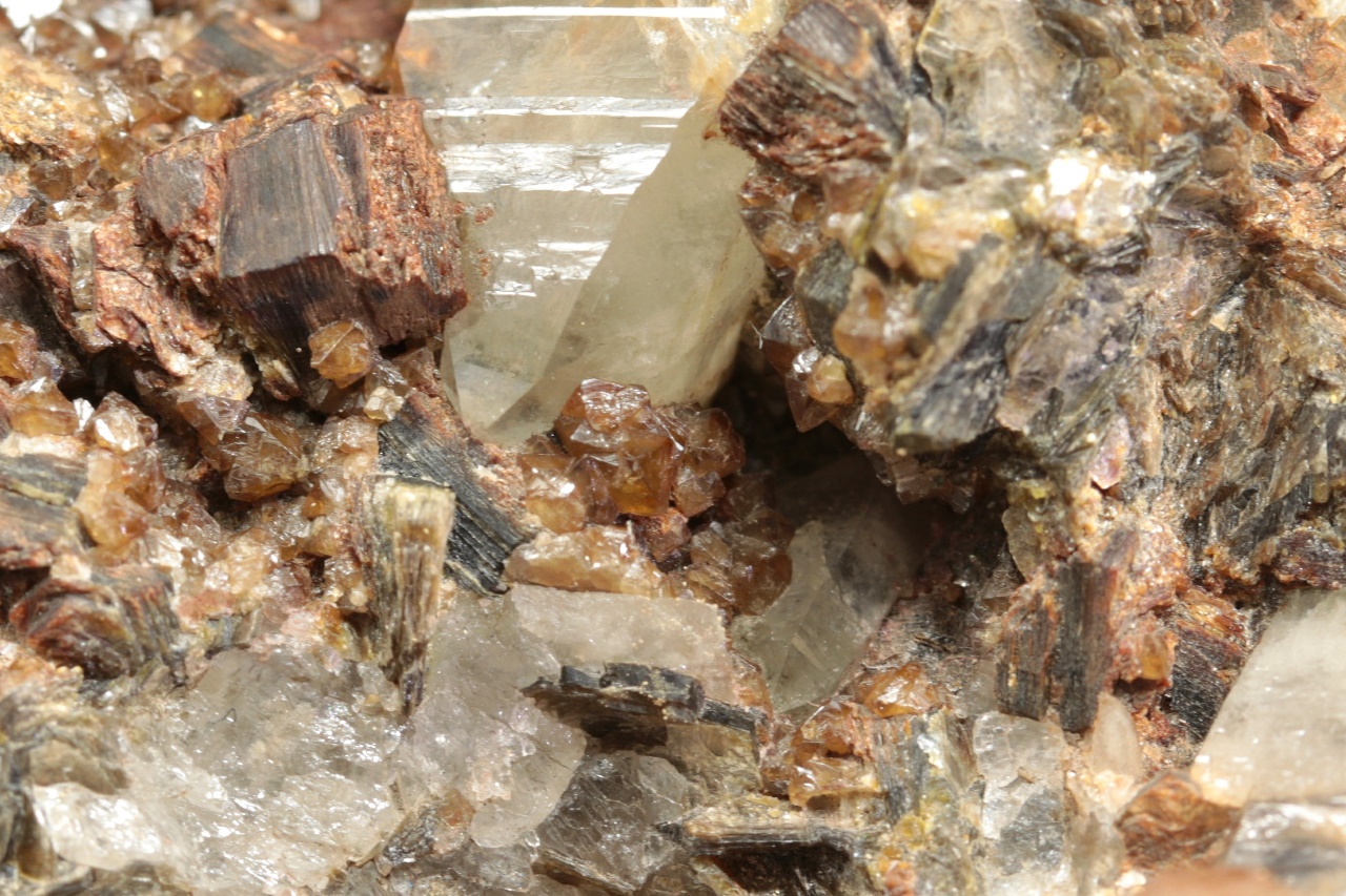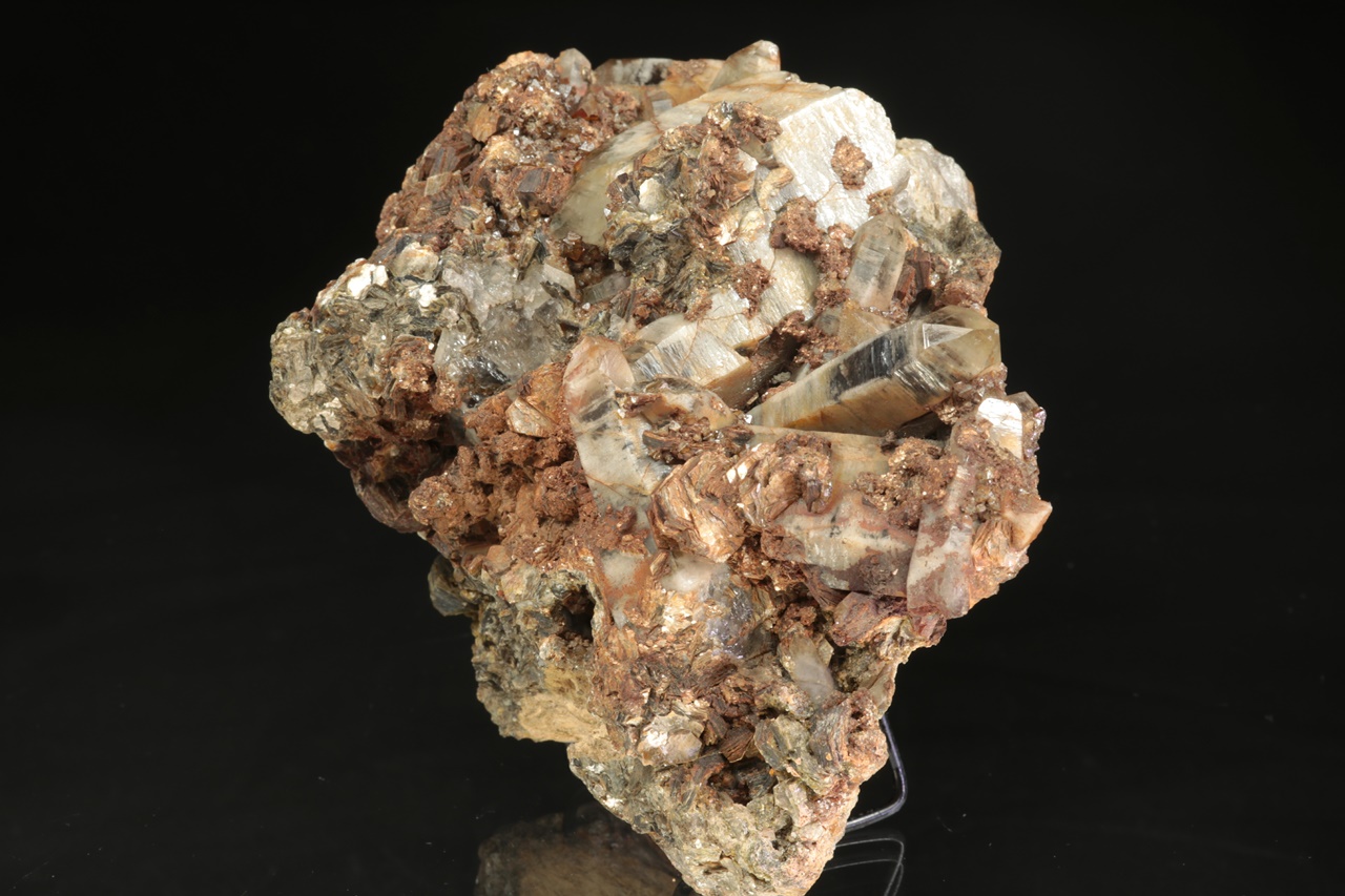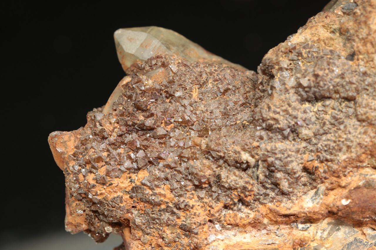 Srostlice krystalů záhnědy pokrytých tabulárními krystaly cinvalditu. V poslední fázi na vzorek narůstají krystaly a shluky krystalů hnědého scheelitu.