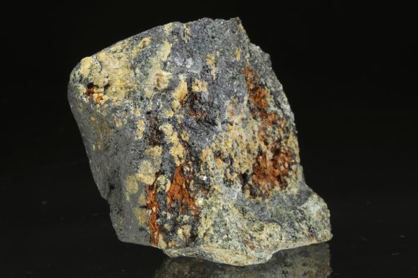 Oktaedrické krystaly světle žlutého hydroxidu hořčíku a cínu rostoucí do dutiny. Krystaly jsou přibližně 1 mm velké.