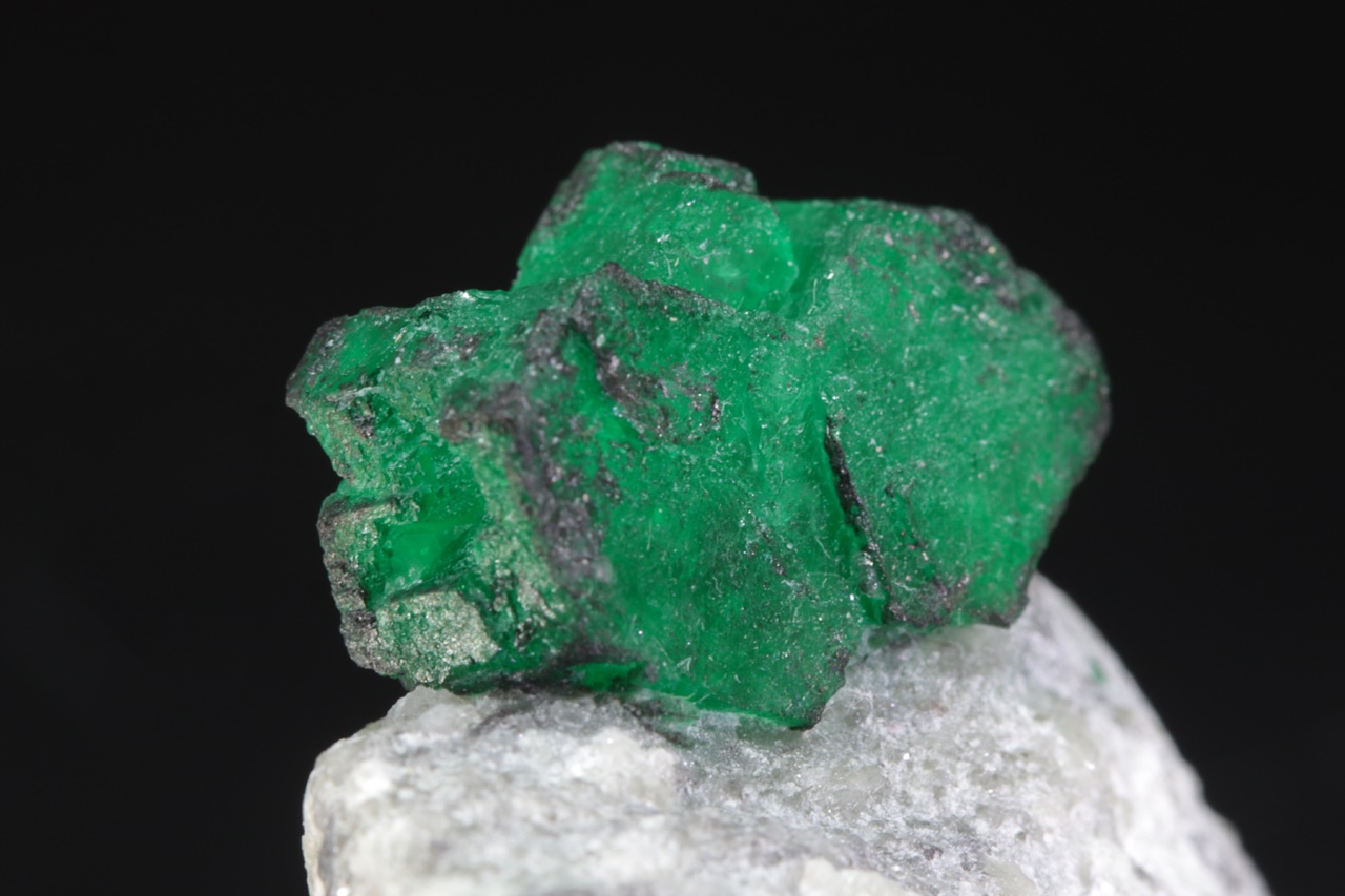 Mimořádně kvalitní ukázka intenzivně zeleného smaragdu drahokamové kvality. Smaragd tvoří srdcovitá srostlice 3 průsvitných krystalů, její rozměry jsou 17 × 12 × 9 mm.
