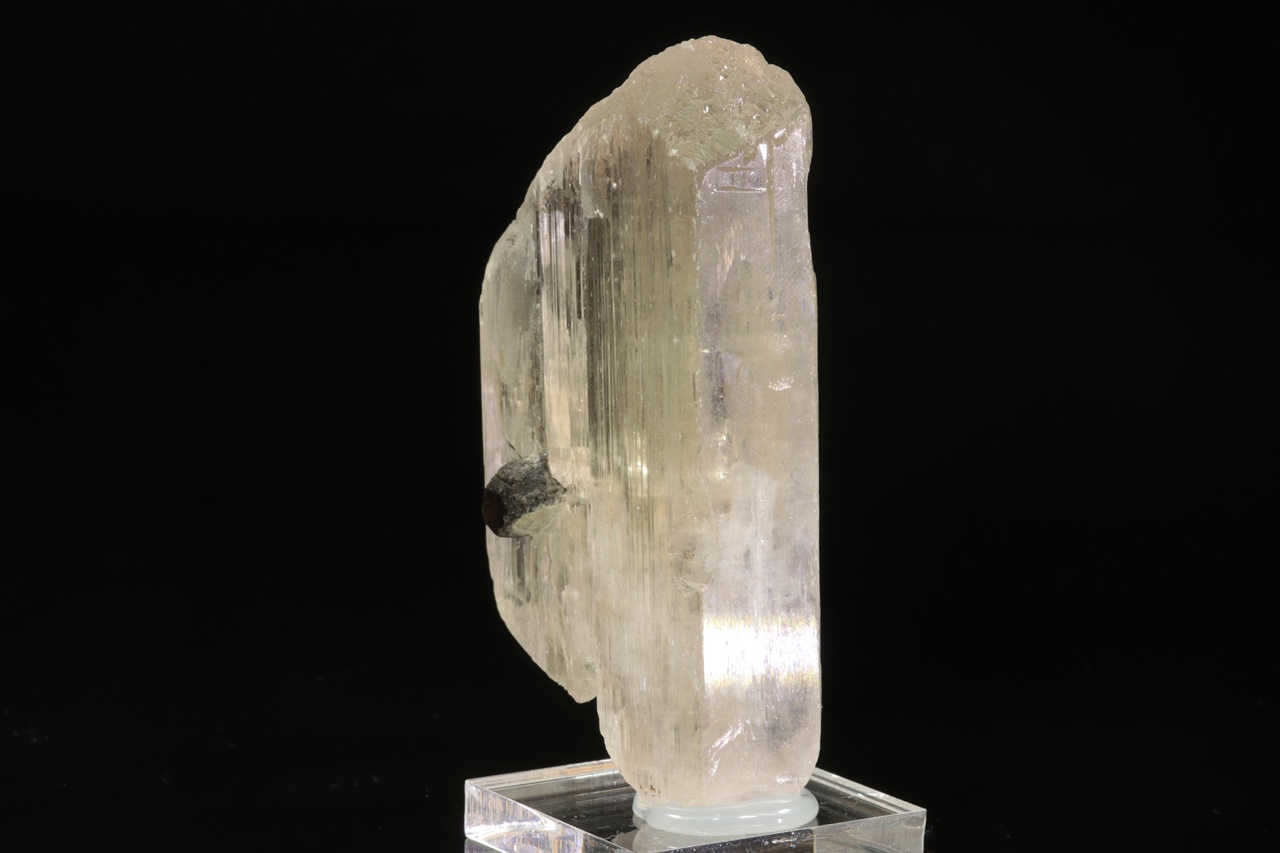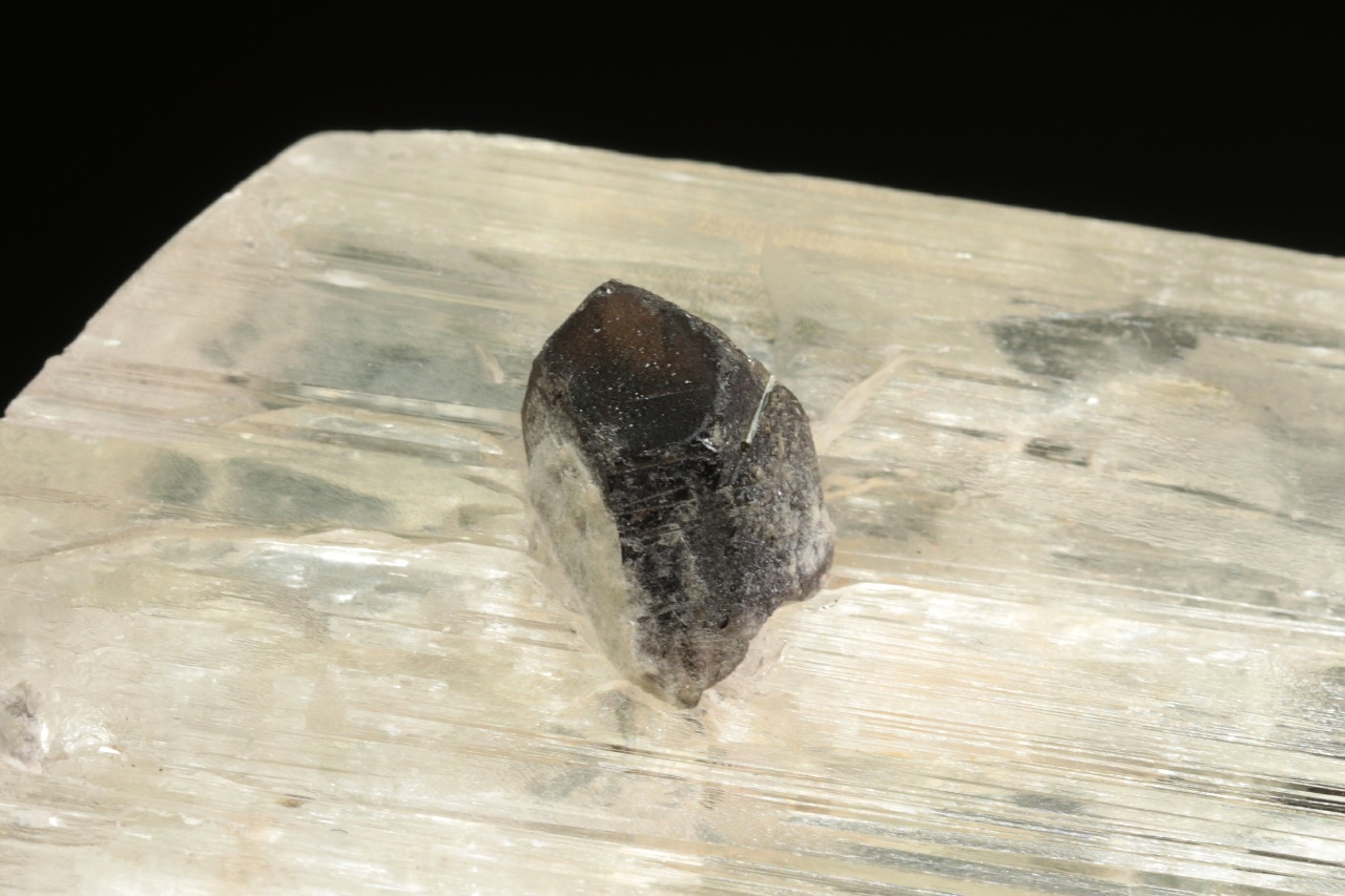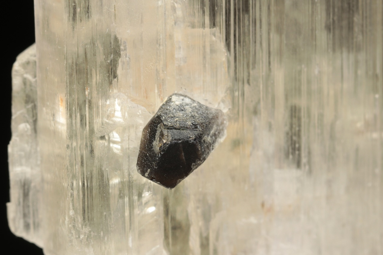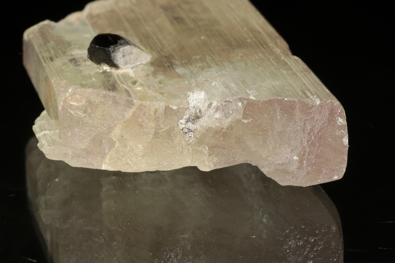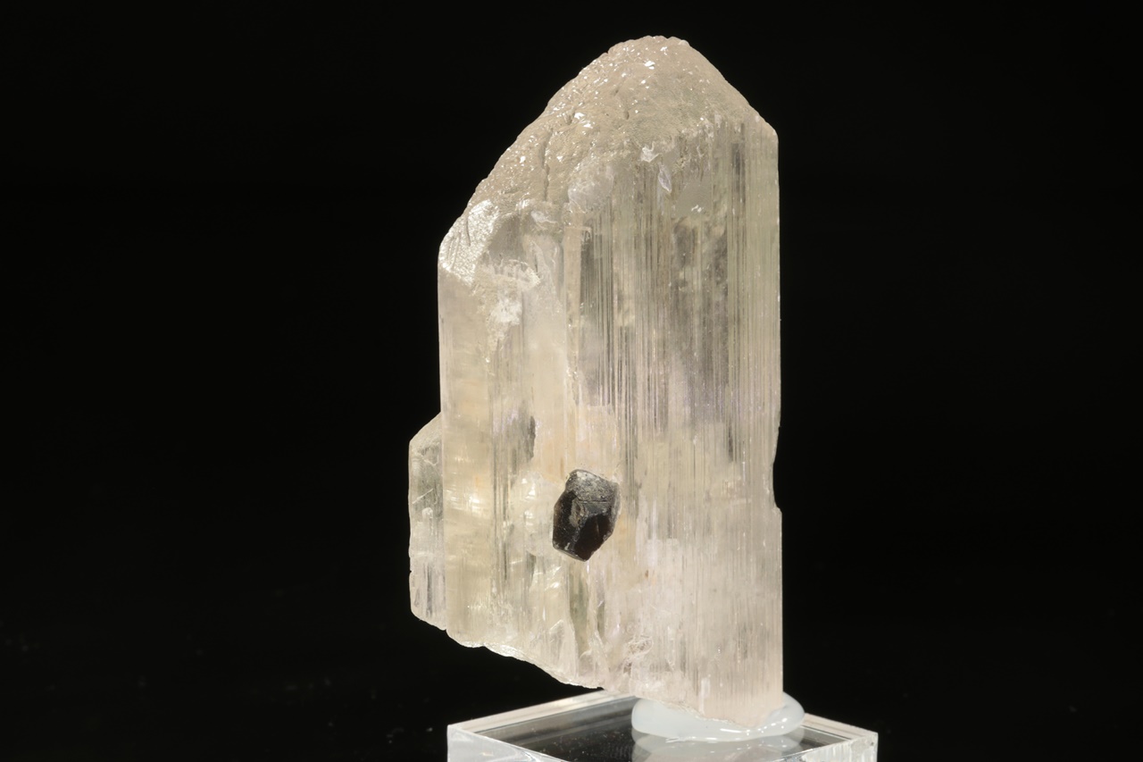 Průhledný krystal čirého spodumenu s lehkými tóny žluté barvy, na který ze strany narůstá 1 cm dlouhý krystal tmavě hnědého turmalínu. Krystal spodumenu je ze spodu dohojený.
