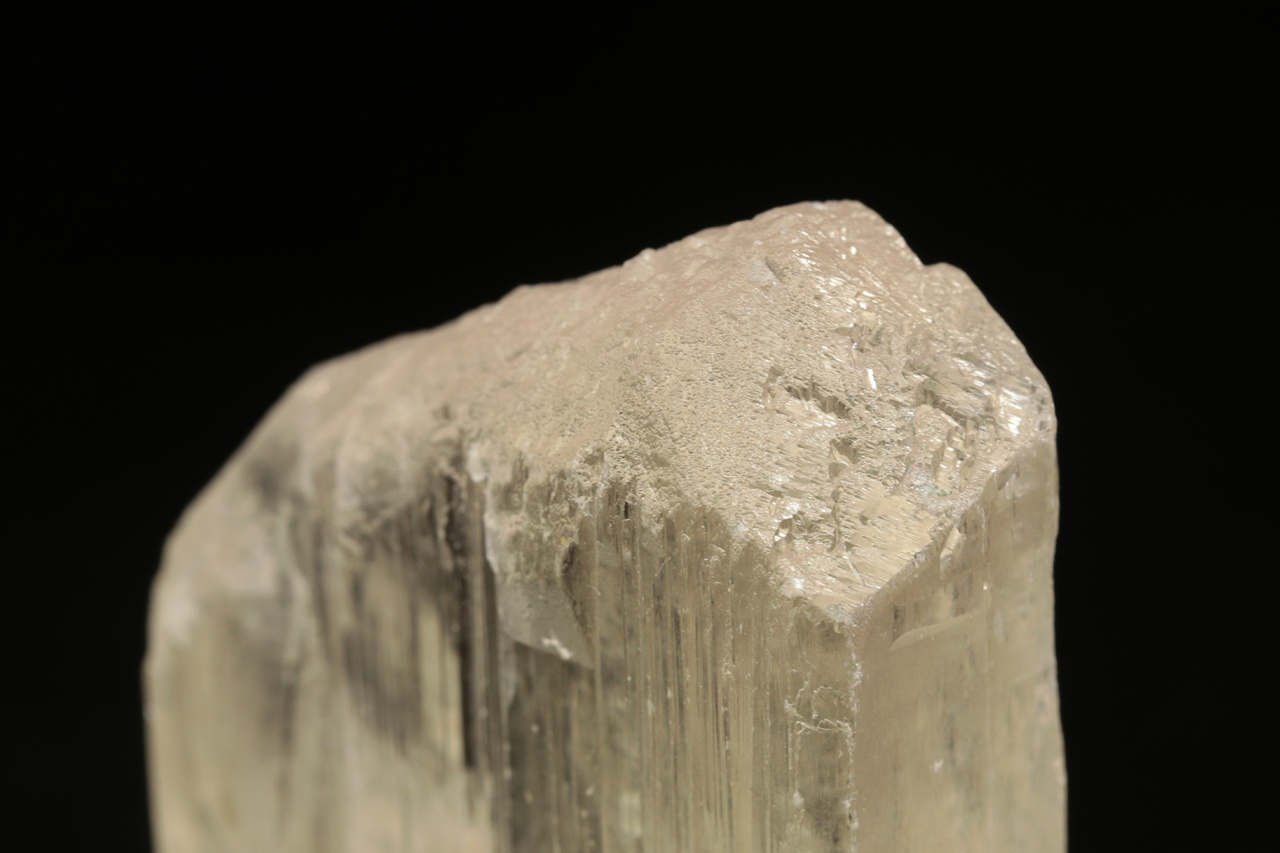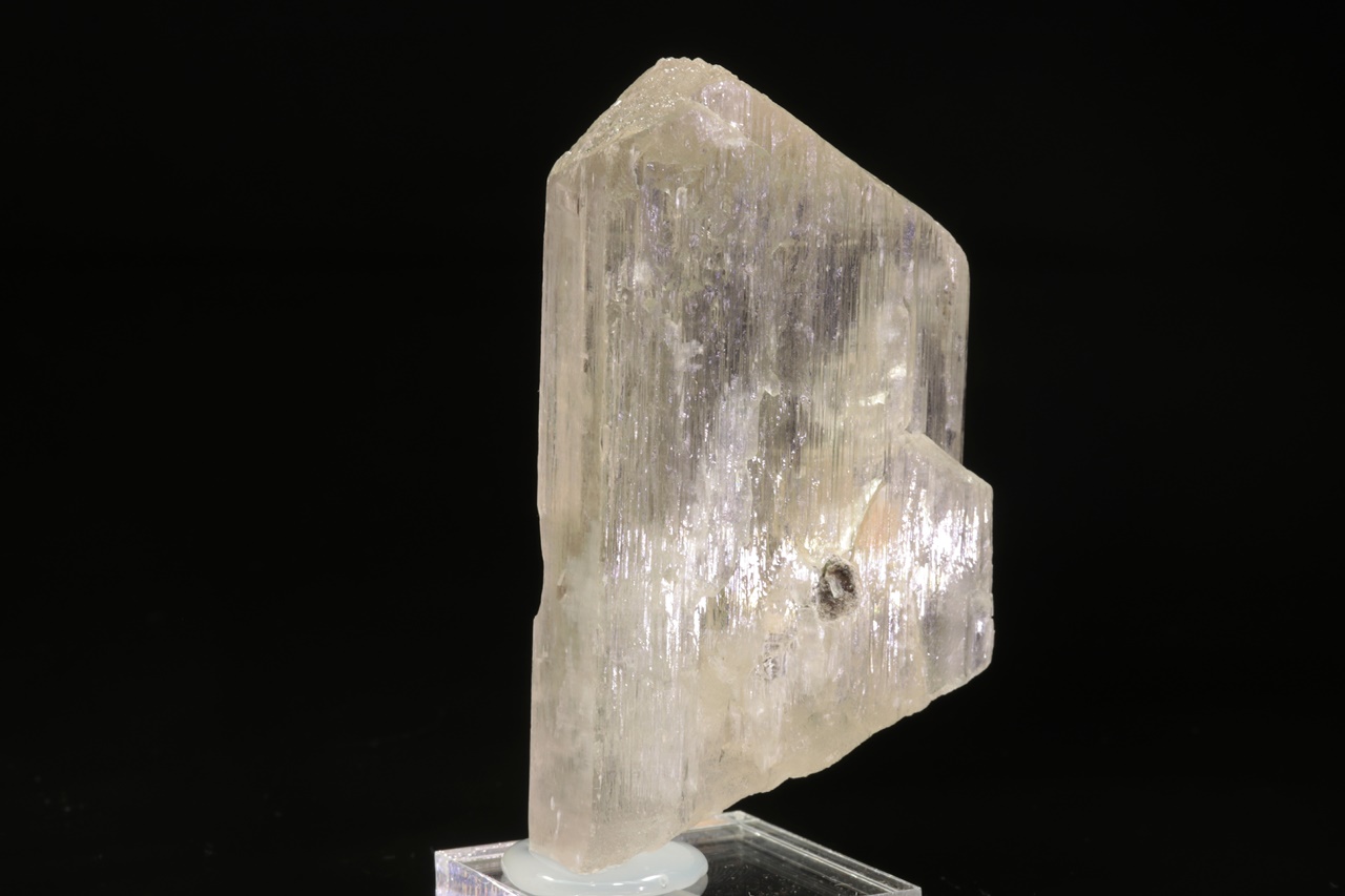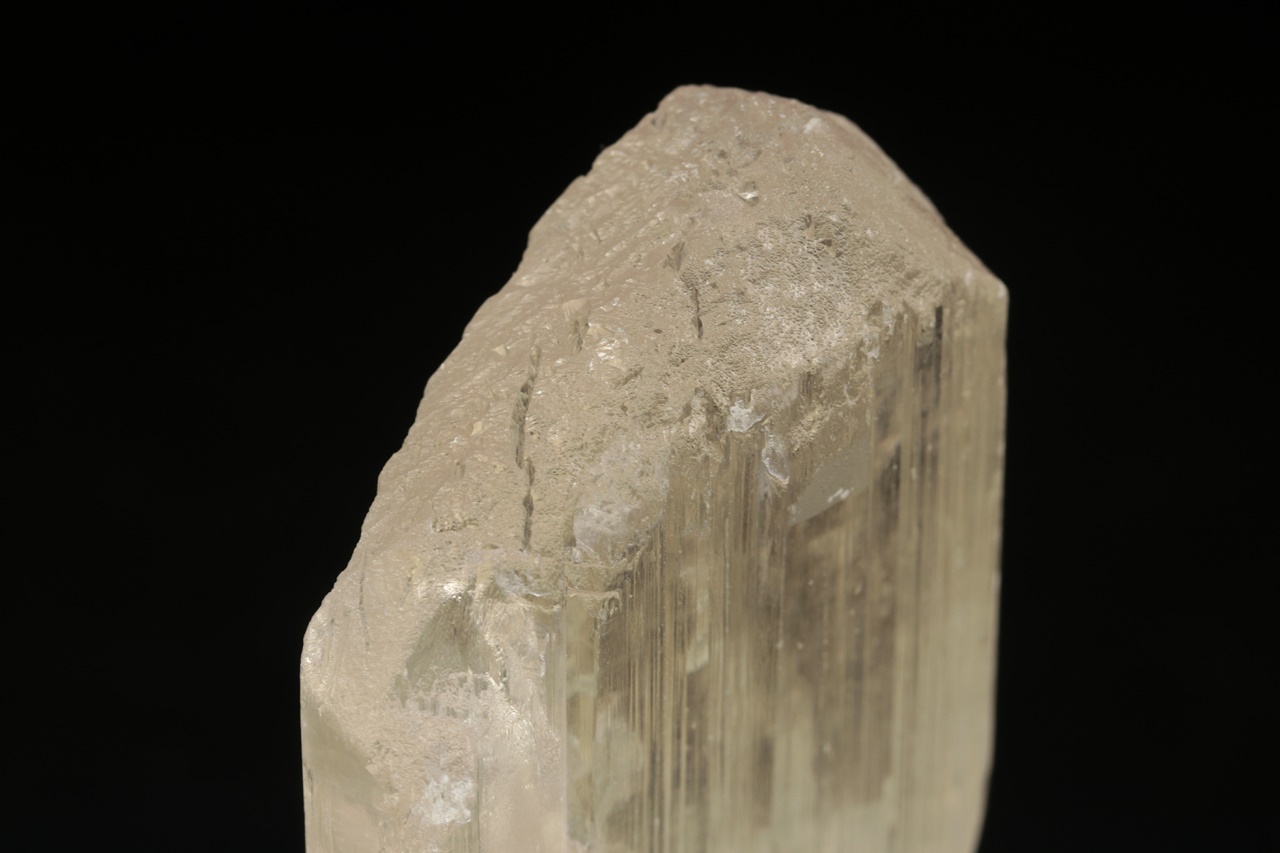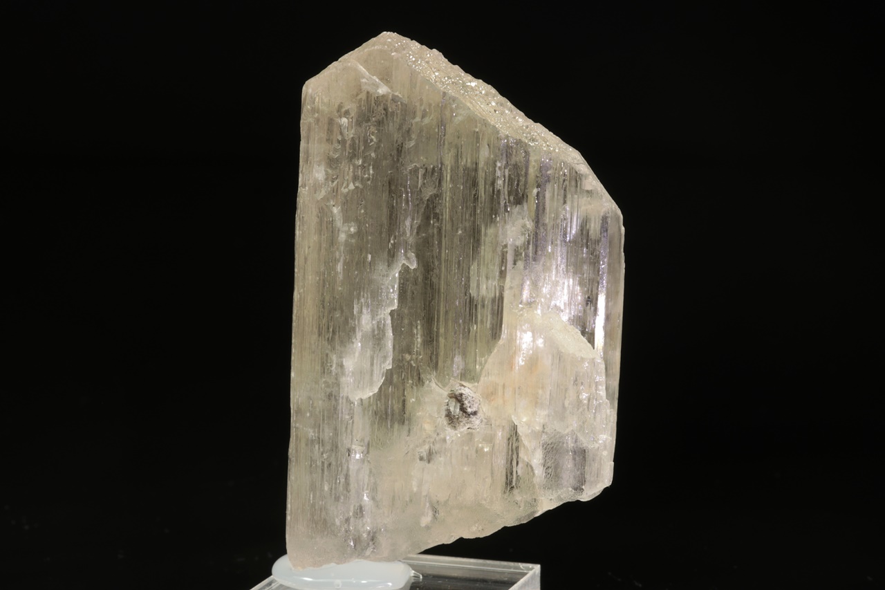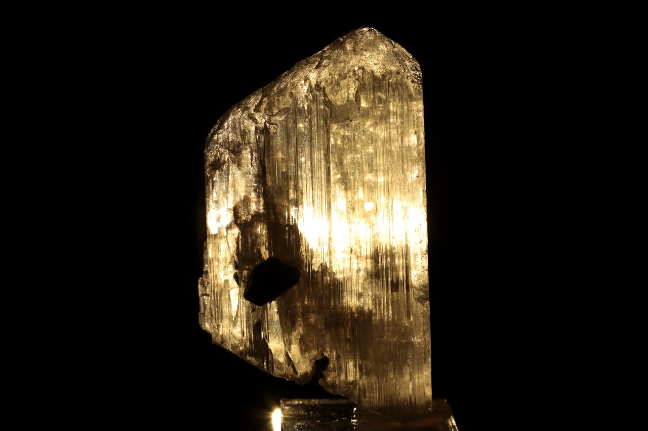 Průhledný krystal čirého spodumenu s lehkými tóny žluté barvy, na který ze strany narůstá 1 cm dlouhý krystal tmavě hnědého turmalínu. Krystal spodumenu je ze spodu dohojený.