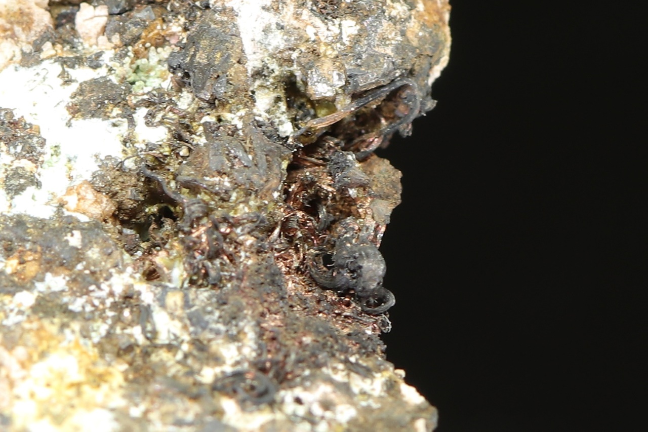 Žíla skutteruditu s dutinami, ve kterých lze pozorovat krystalové plochy skuteruditu a místy i lokny ryzího stříbra s krystalem argentitu.