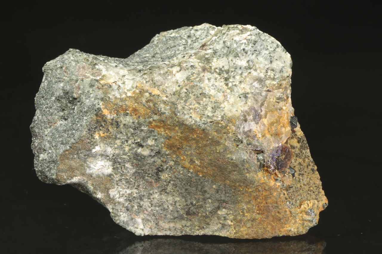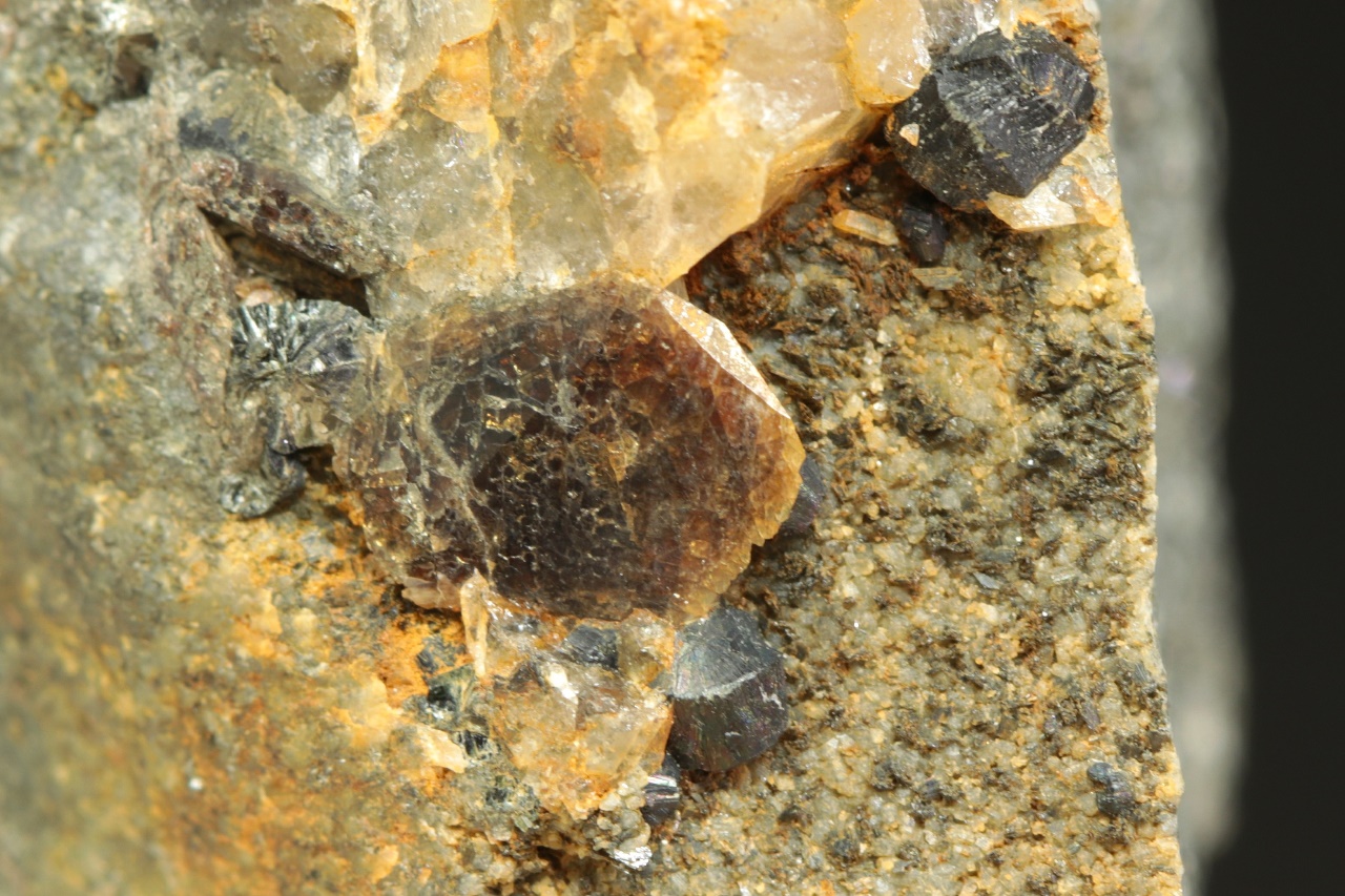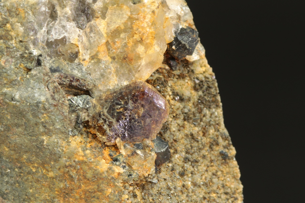 Sedm milimetrů velký krystal fialovo hnědého titanitu s tmavě zeleným klinochlorem z lomu Mirošov.