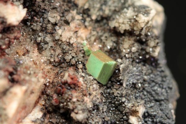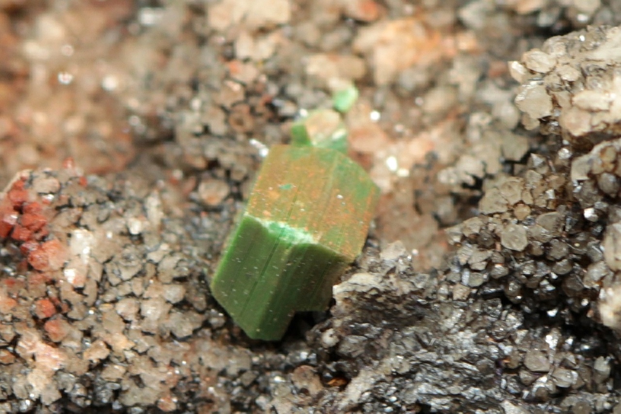Dva a půl milimetru velký krystal zeleného torbernitu z uranového ložiska Předbořice.