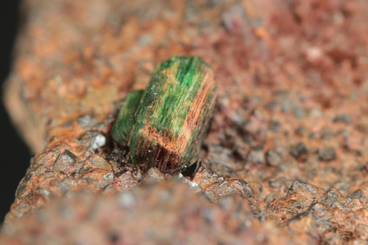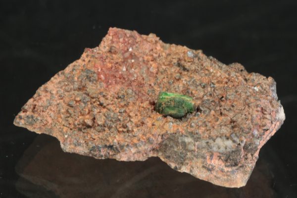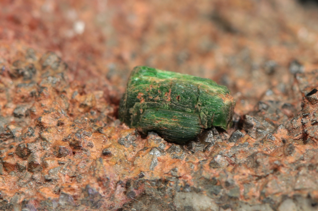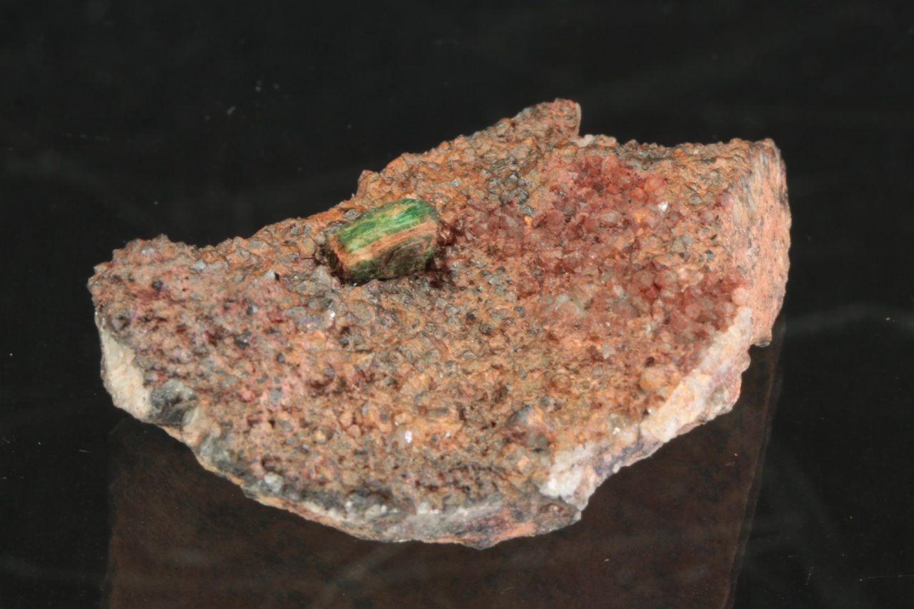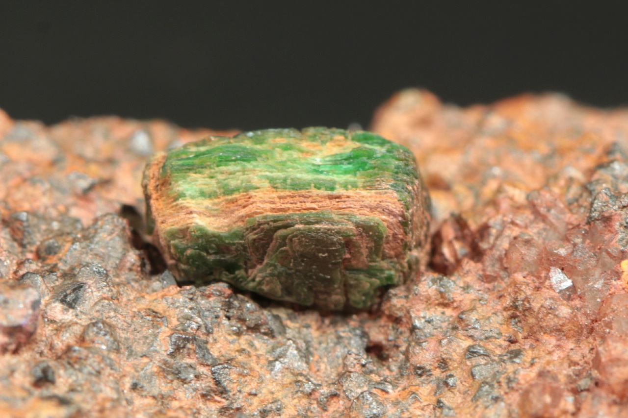 Šest milimetrý velký krystal torbernitu z uranového ložiska Předbořice narostly na křemenné podložce.