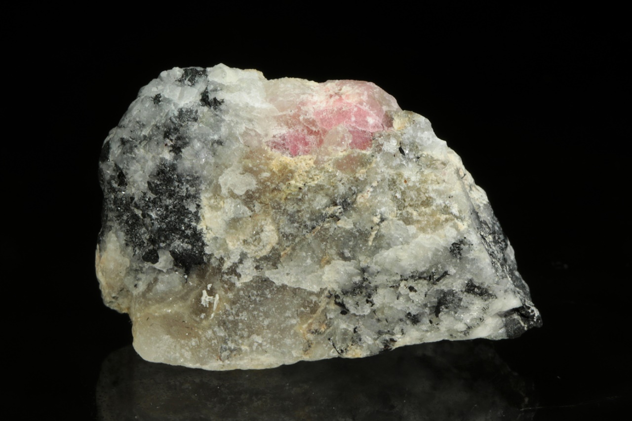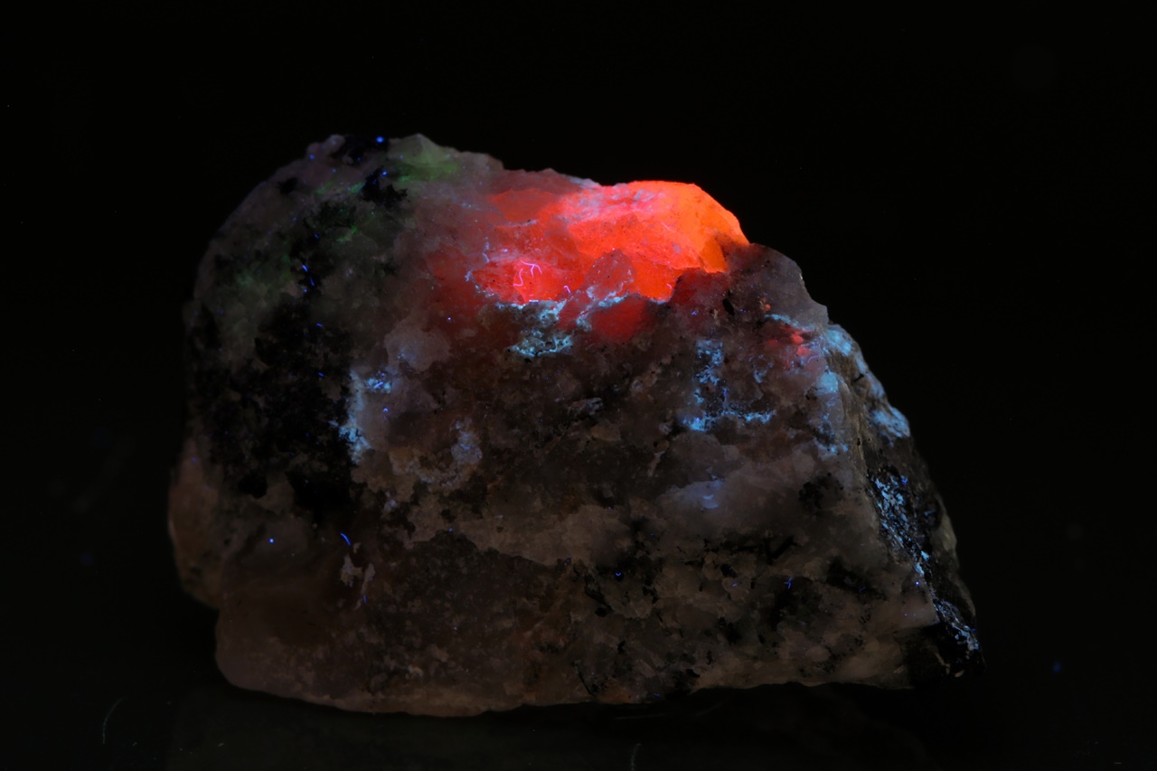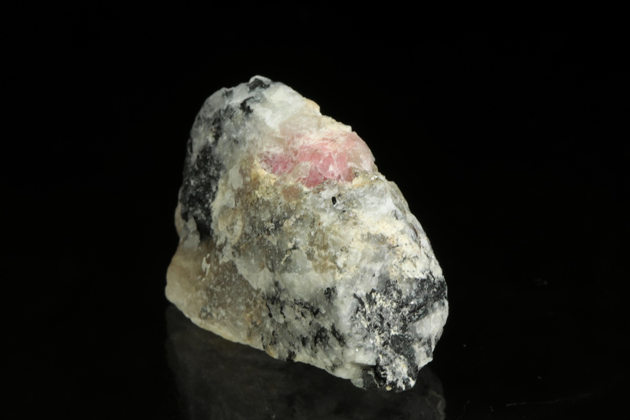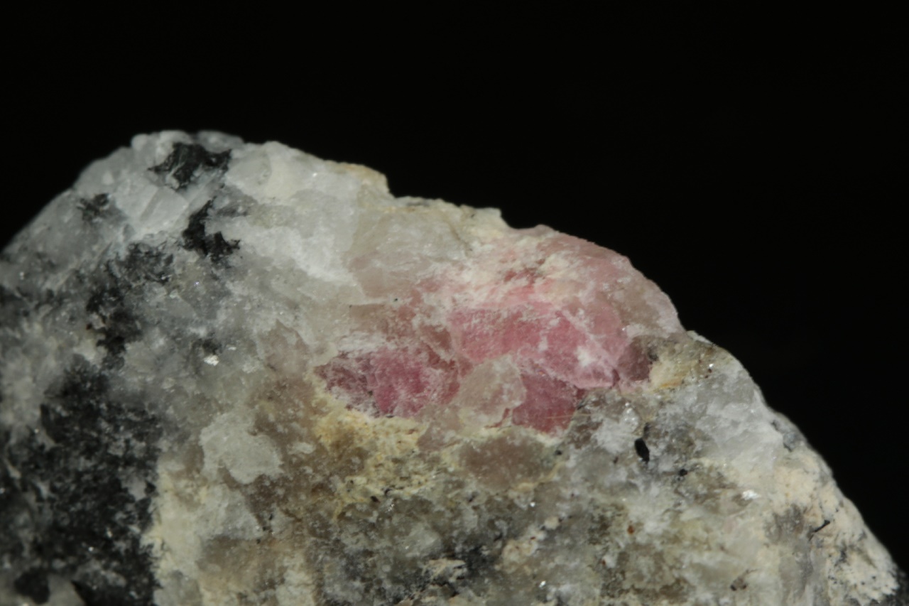Růžové zrno (asi 8 mm velké) vzácného silikátu berylia – tugtupitu se schopnosti tzv. tenebrescence (po nasvícení UV zářením na čas změní barvu).