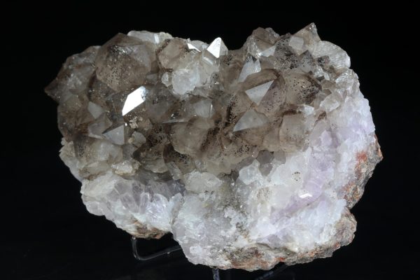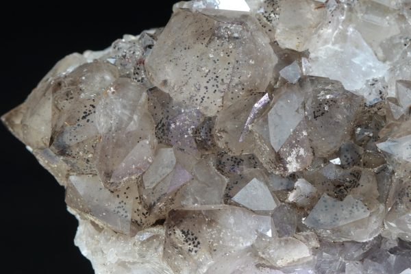Drúza na vrcholku průhledných krystalů světlé záhnědy s četnými černými inkluzemi. Vzorek je lepený.
