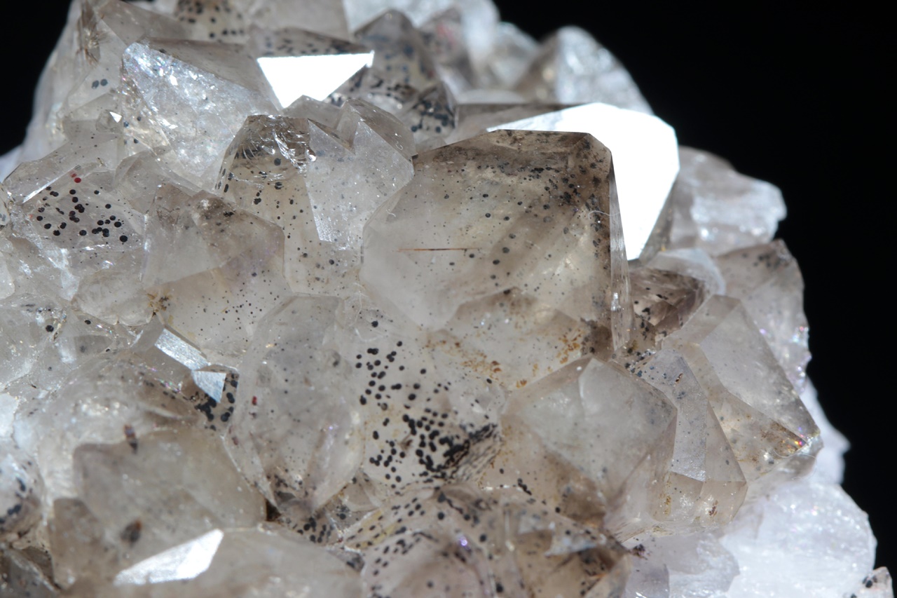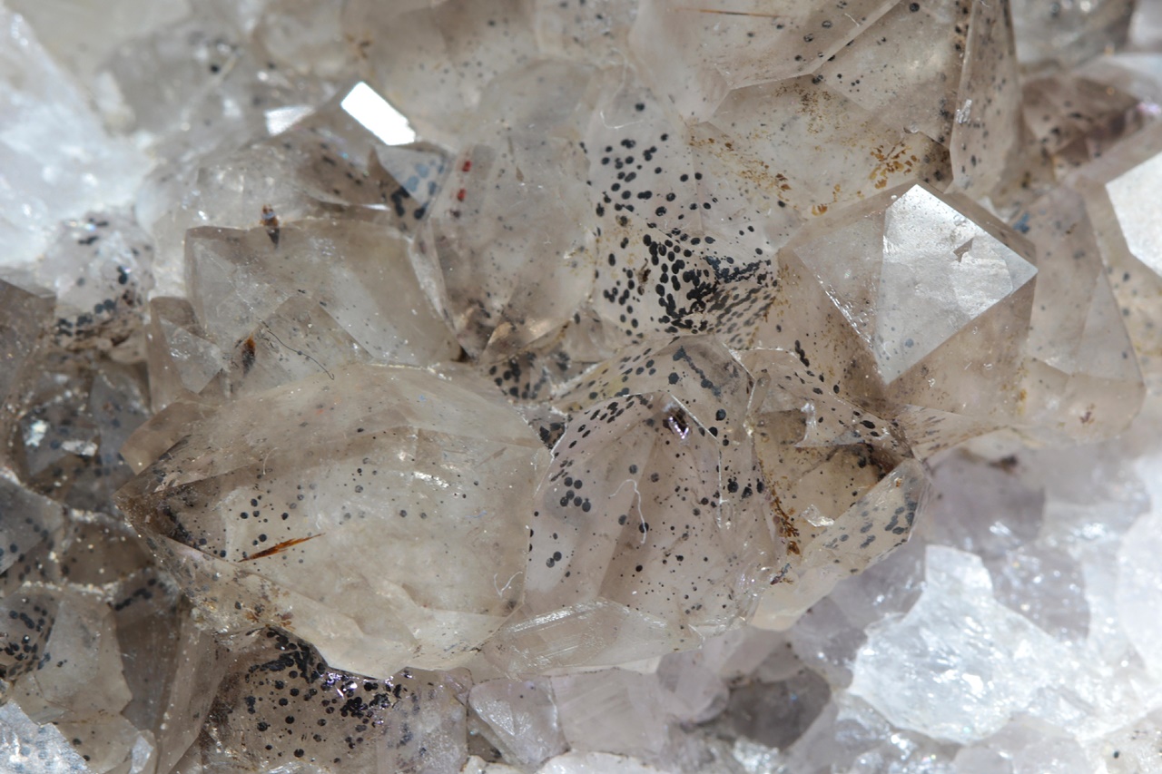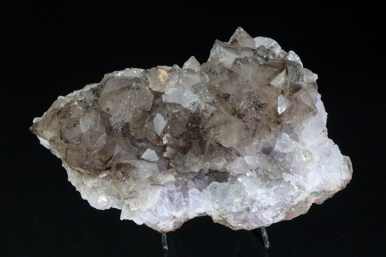 Drúza na vrcholku průhledných krystalů světlé záhnědy s četnými černými inkluzemi. Vzorek je lepený.