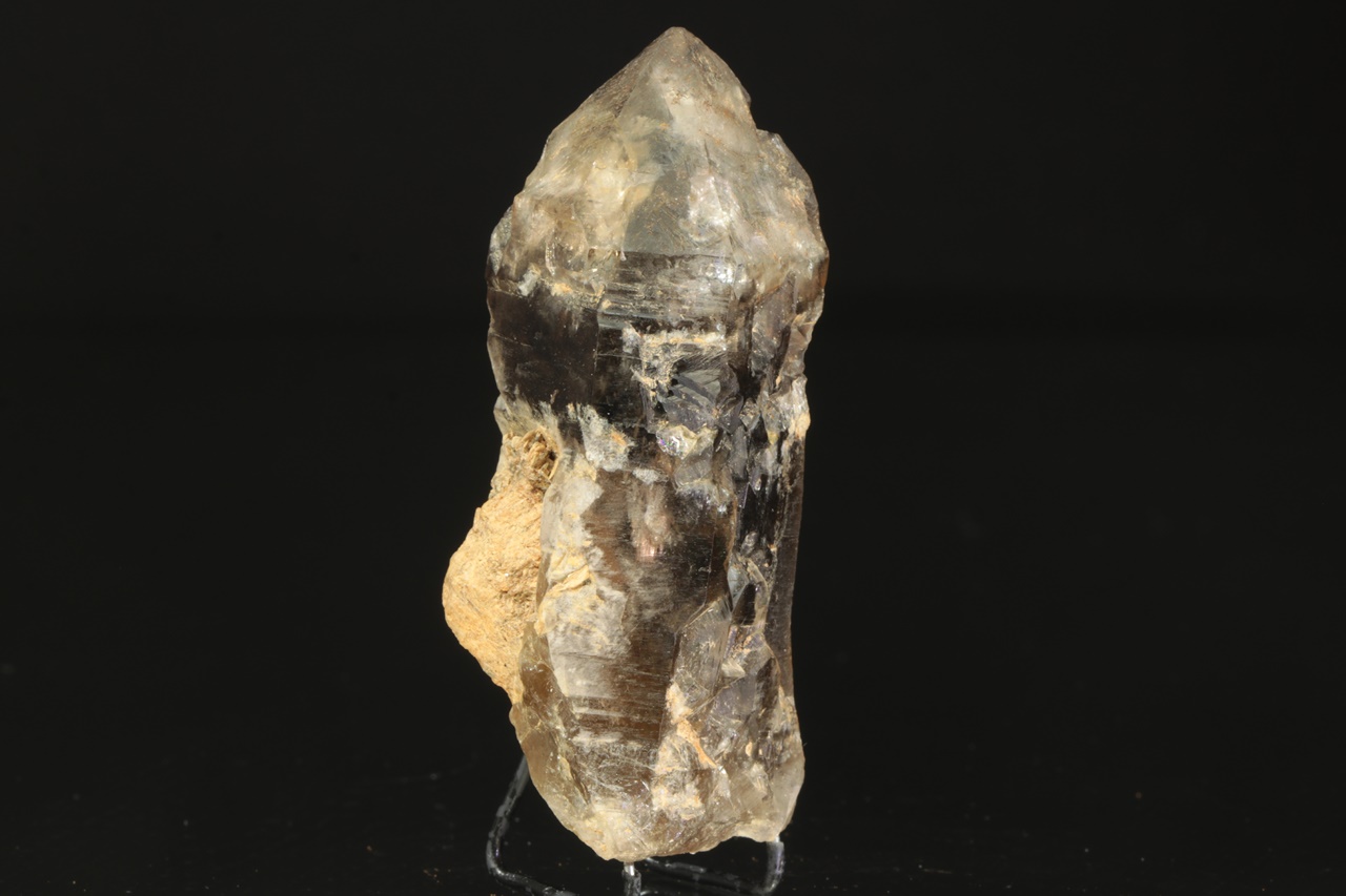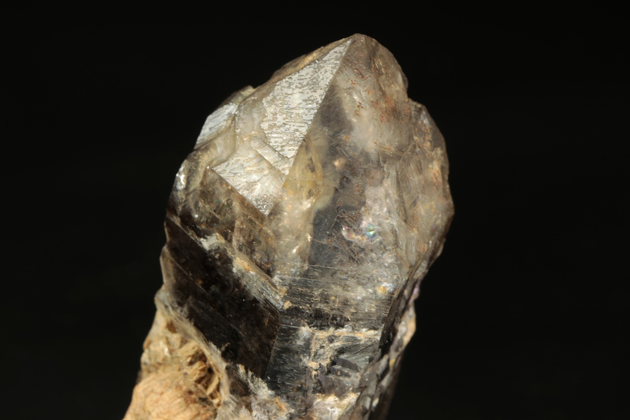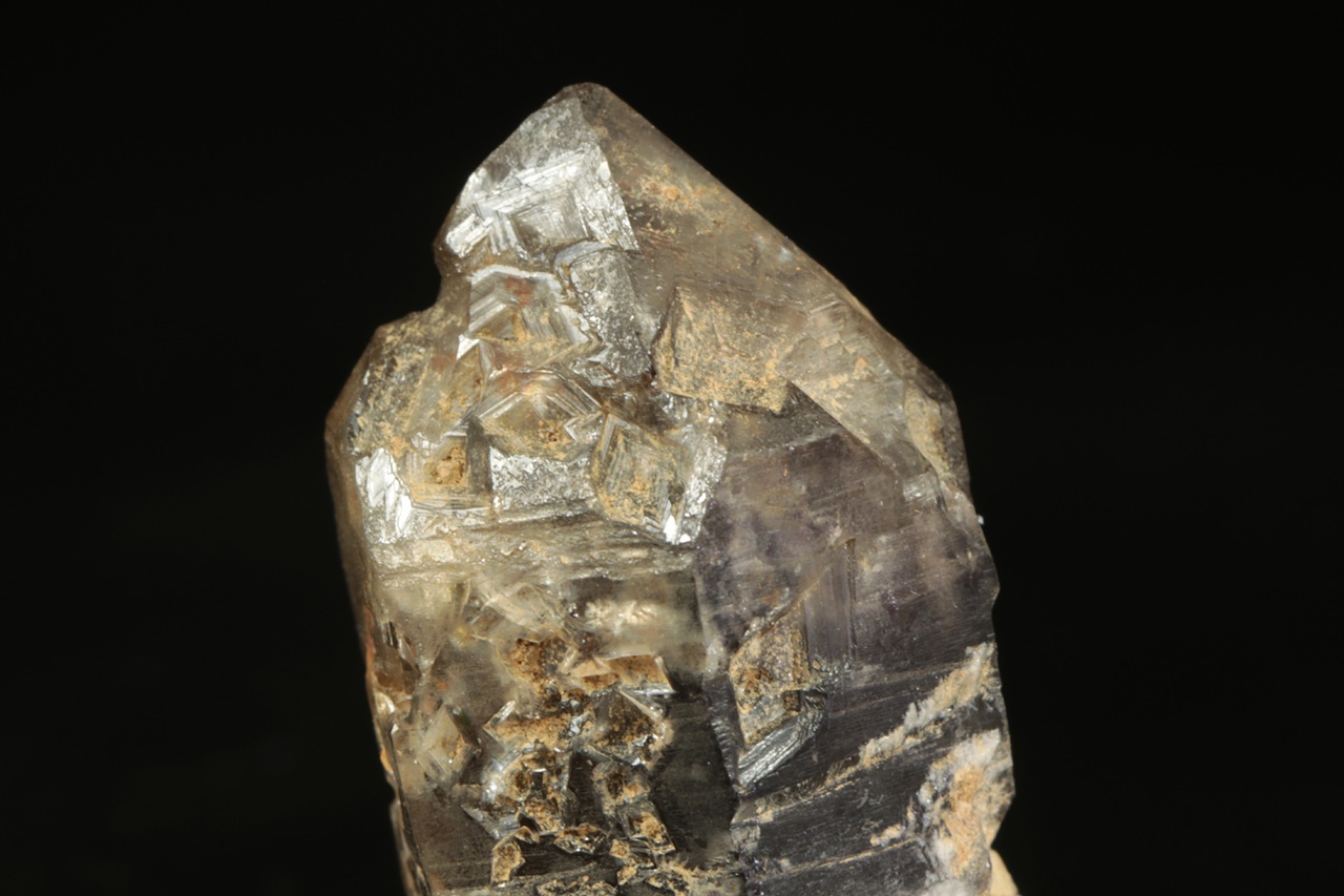 Dvougenerační krystal záhnědy, kdy na starší tmavší krystal narůstá na špičce světlejší zóna s lesklými plochami.