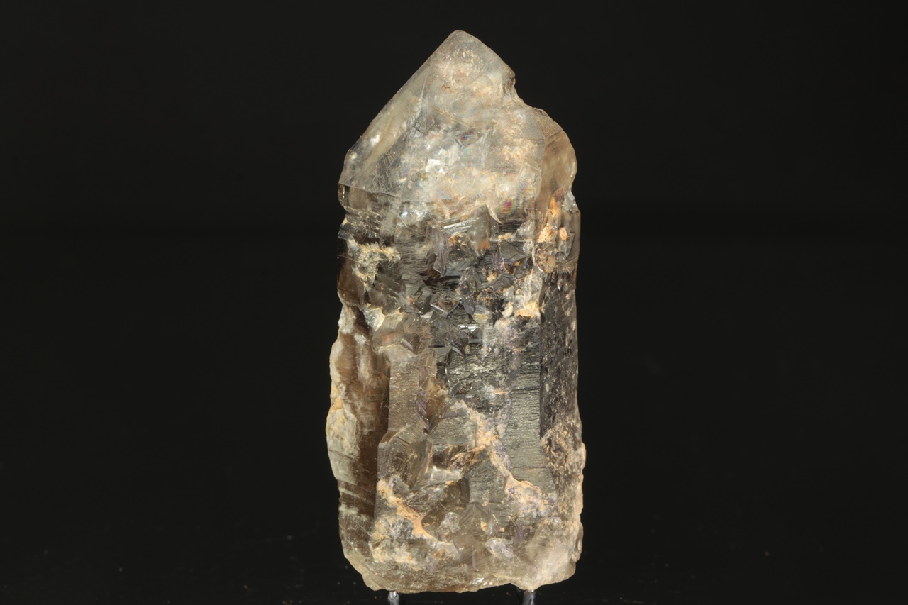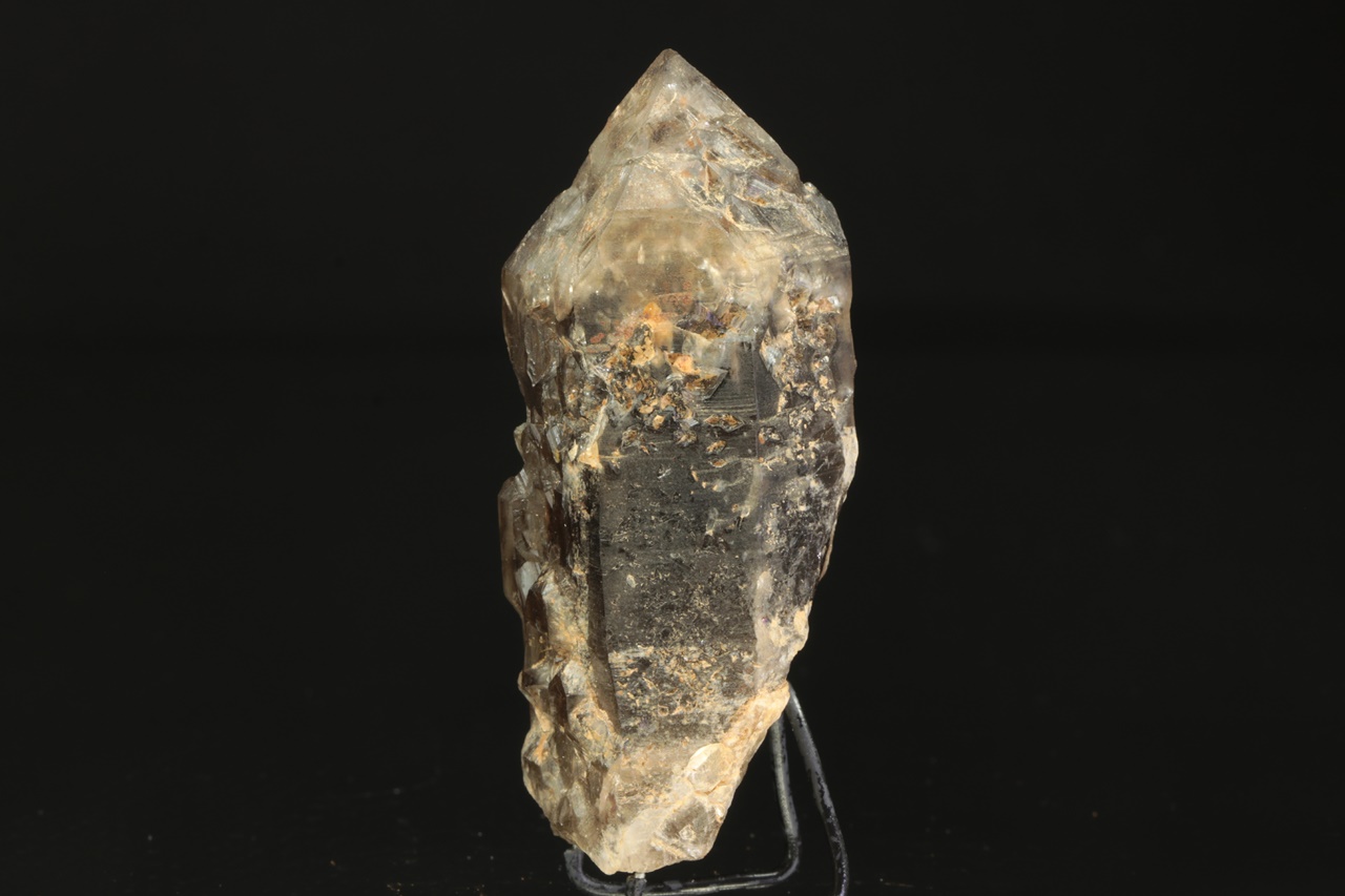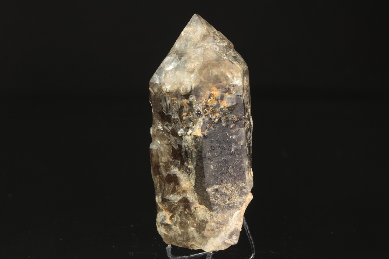 Dvougenerační krystal záhnědy, kdy na starší tmavší krystal narůstá na špičce světlejší zóna s lesklými plochami.