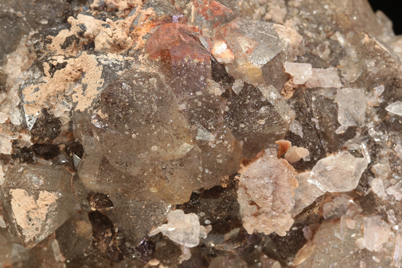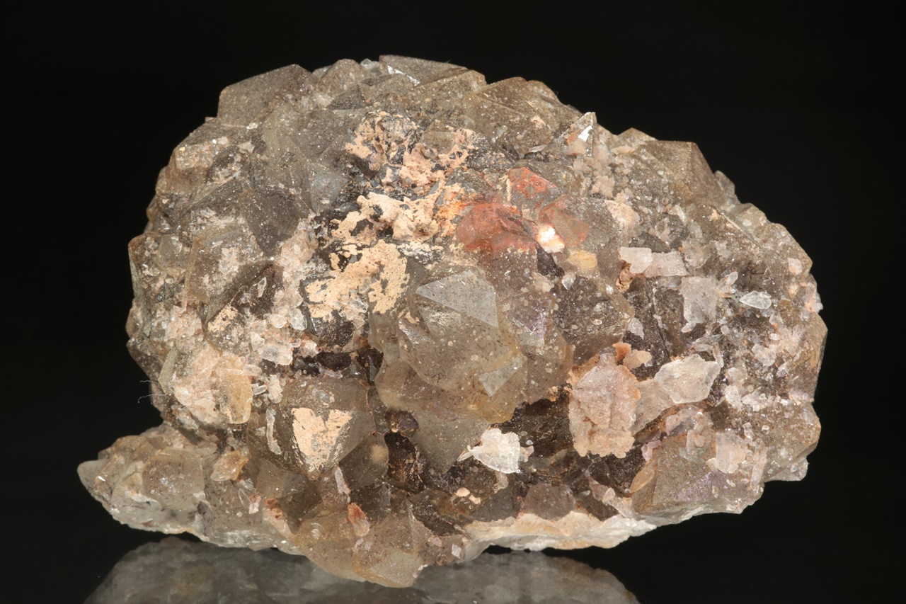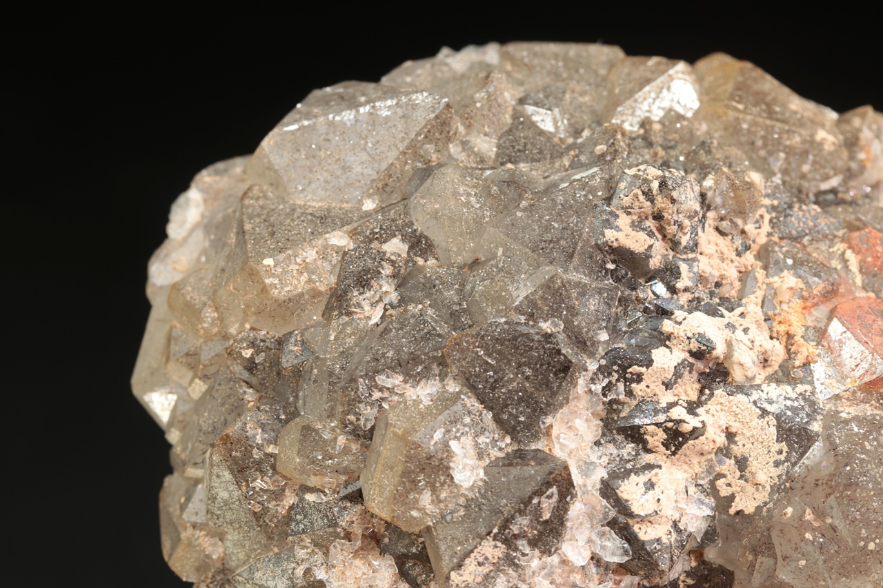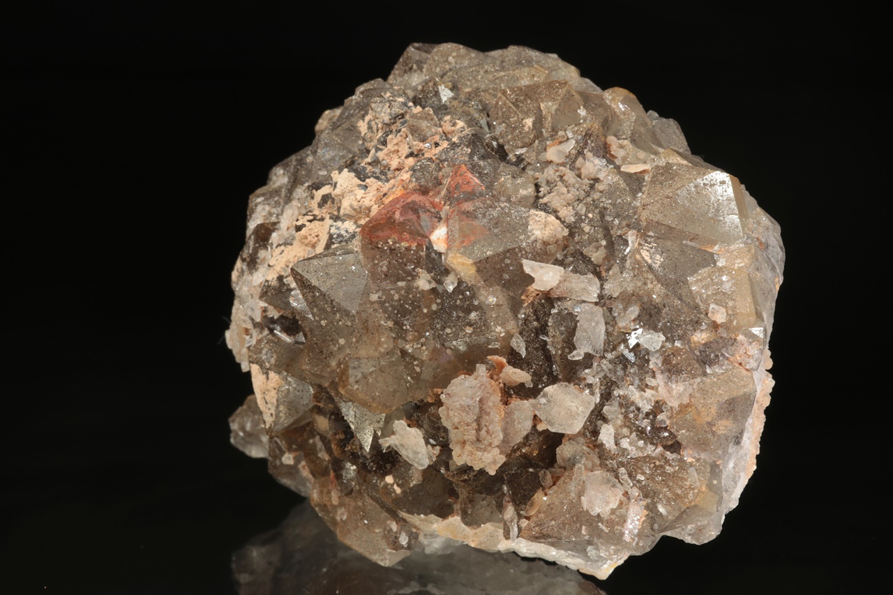 Oblá drúza krystalů světlé záhnědy. Na povrch krystalů jsou velmi dobře vidět přírodní lepty, ale zároveň na ně narůstají krystalky mladší generace křemene.