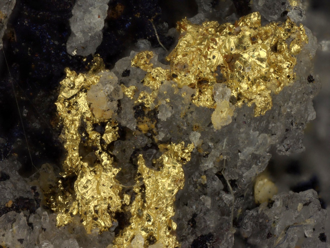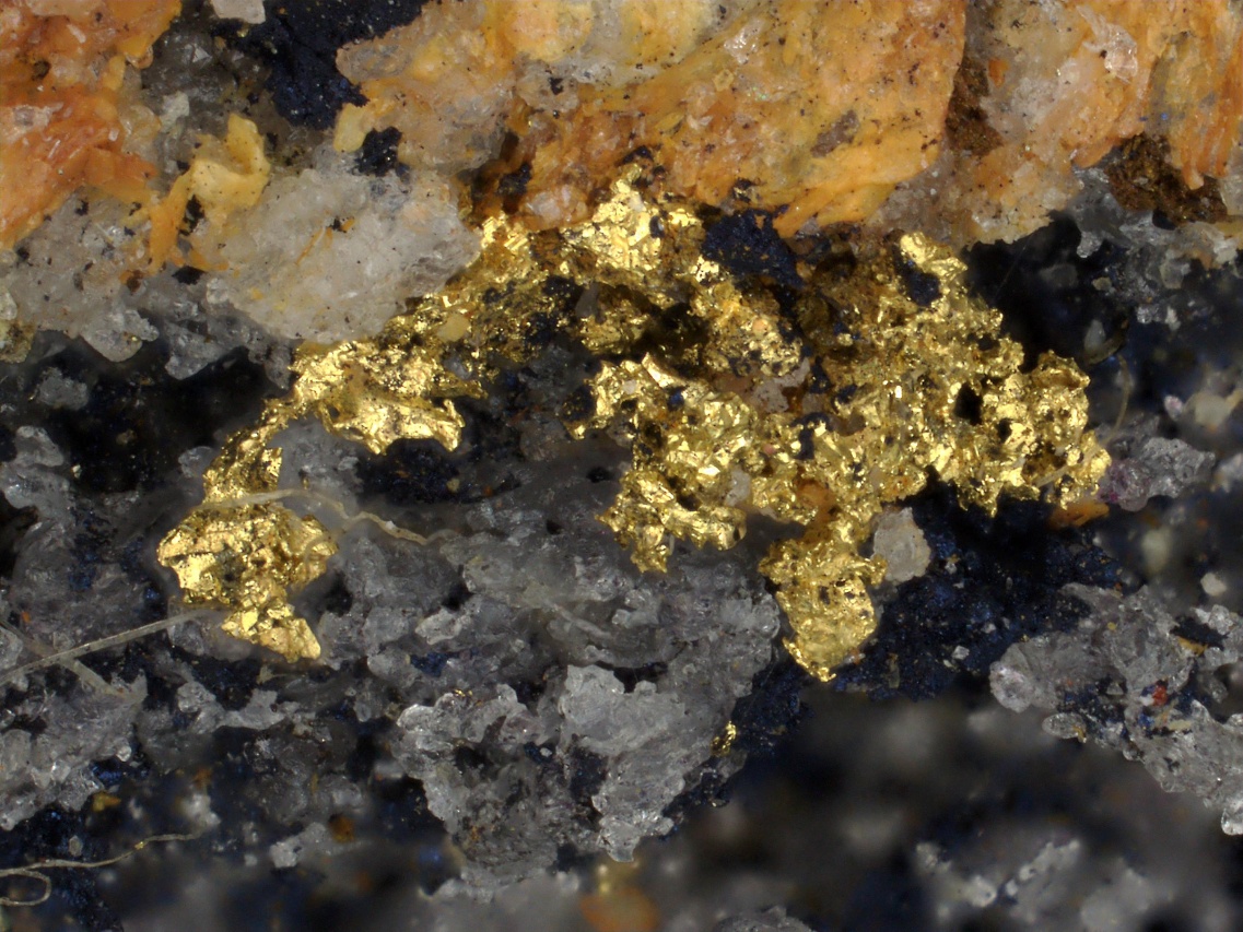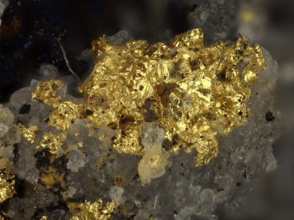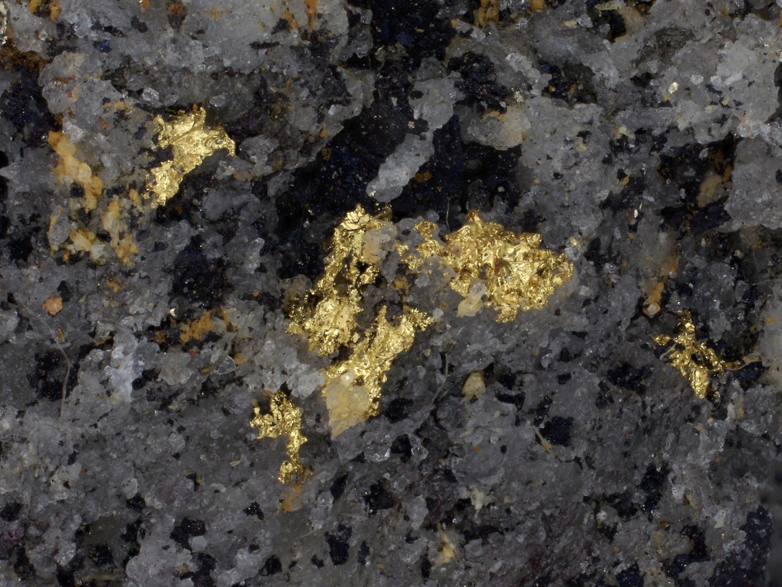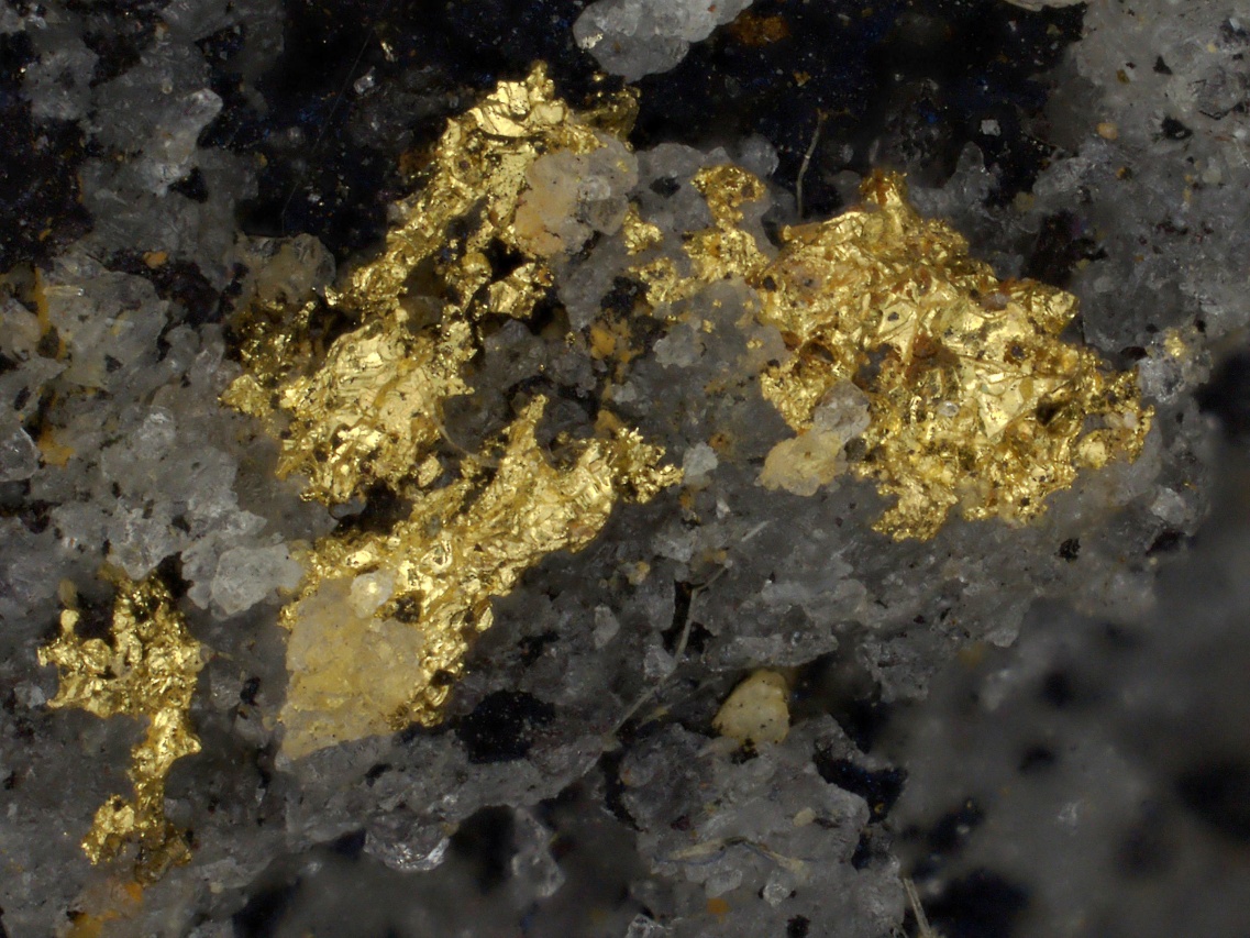 Velmi bohatá ukázka 3-4 mm velkých zlatinek na porézním křemeni s pyritem. Typický neobvykle bohatý vzorek zlata ze Zlatých Hor.