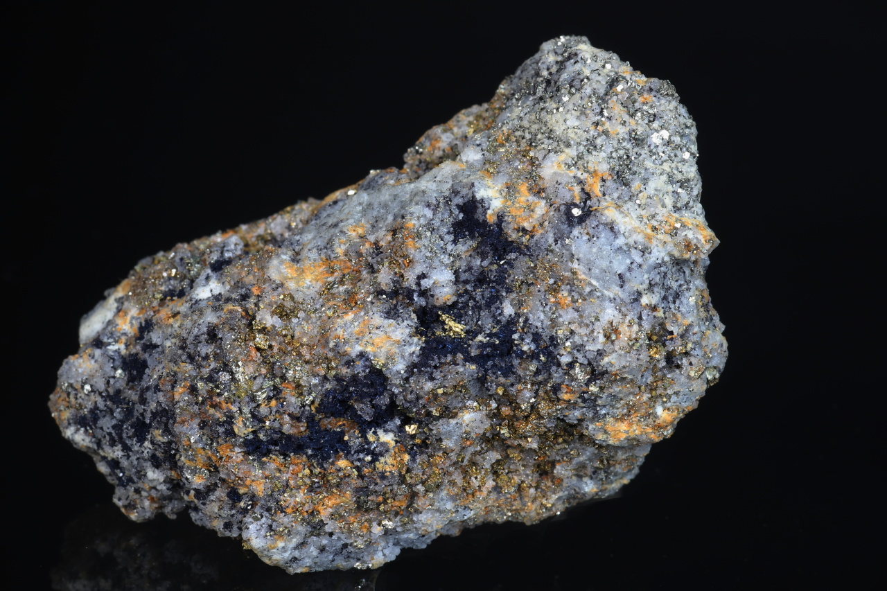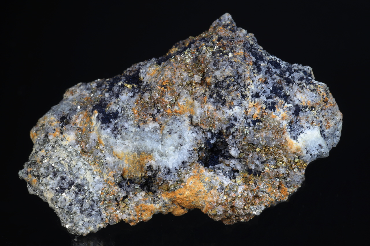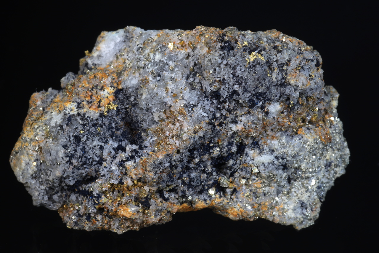 Velmi bohatá ukázka 3-4 mm velkých zlatinek na porézním křemeni s pyritem. Typický neobvykle bohatý vzorek zlata ze Zlatých Hor.