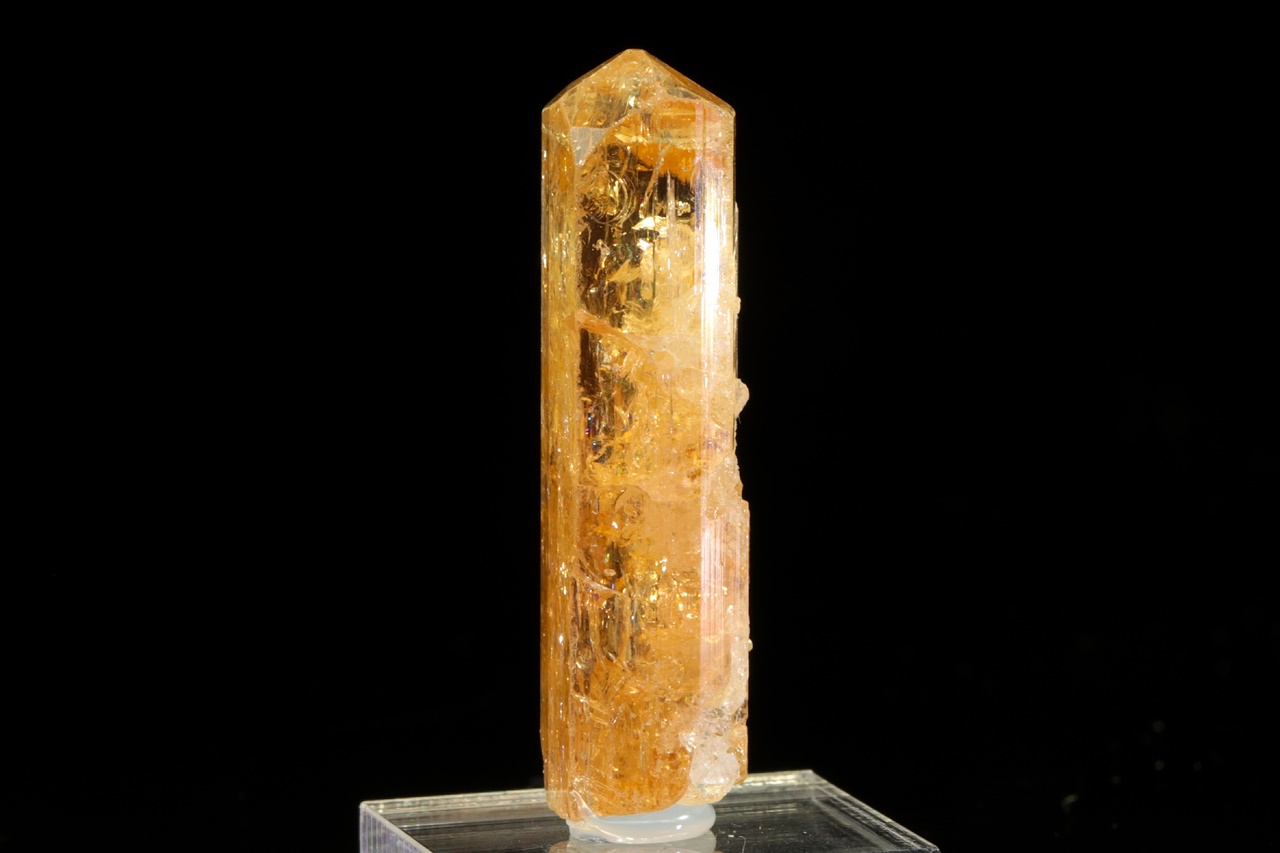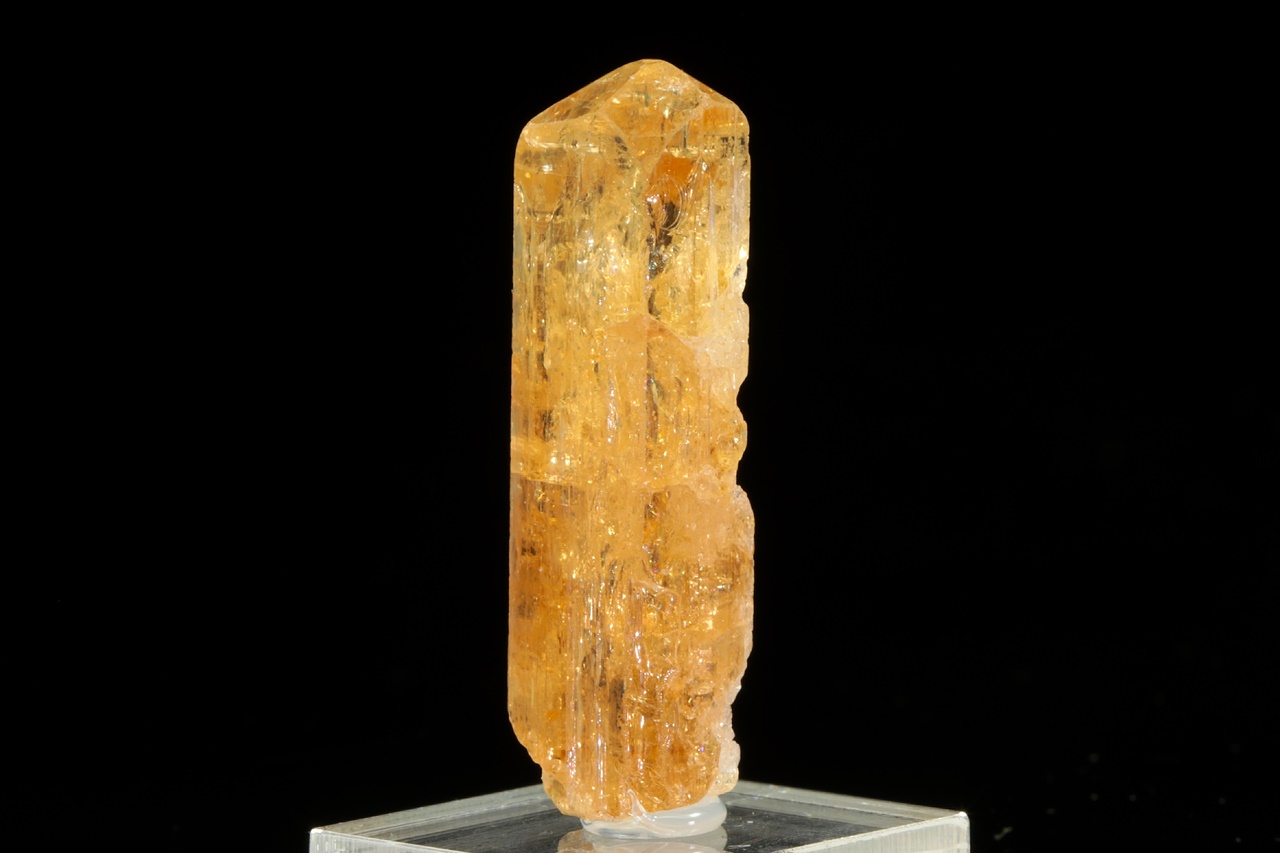 Krystal topazu nádherně žluté barvy. Krystal je z jedné strany přírodně korodovaný.