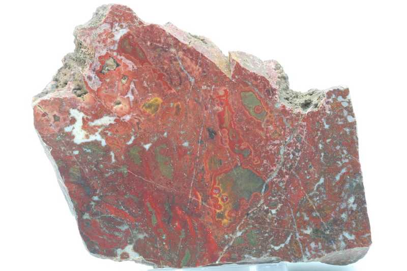 Železitý křemen s řídce se vyskytujícími pisolity, koncentrickými kulovitými agregáty, barevně odlišenými od okolního křemene. Reprezentativní ukázka pro jineckou lokalitu křemene.. Vzorek železitého křemene s červenými až hnědými pisolity v zelené matrix.